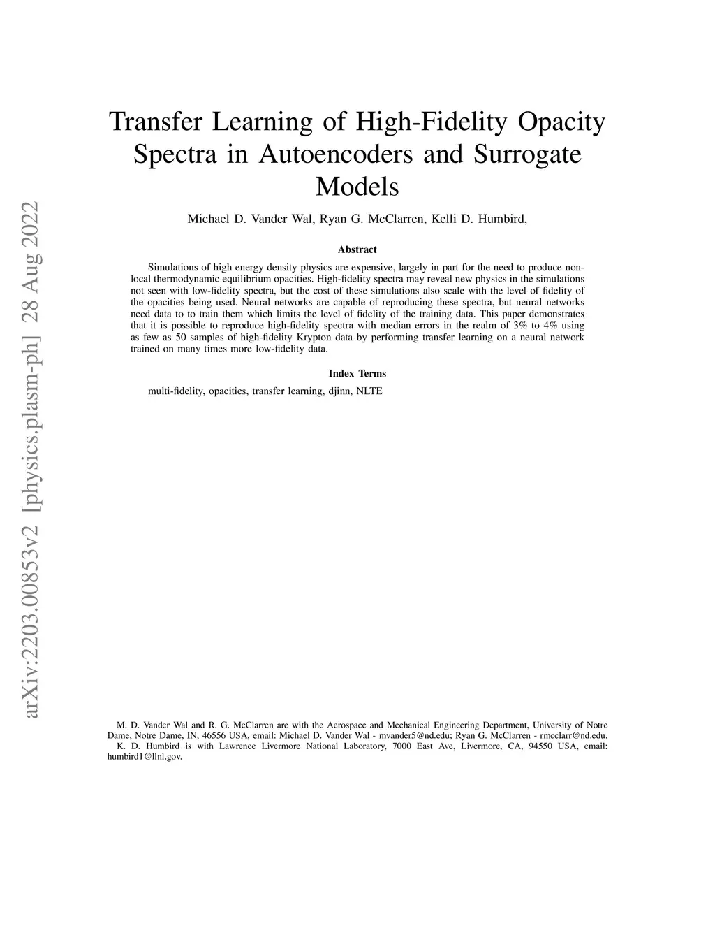 Simulations of high energy density physics are expensive, largely in part for the need to produce non-local thermodynamic equilibrium opacities. High-fidelity spectra may reveal new physics in the simulations not seen with low-fidelity spectra, but the cost of these simulations also scale with the level of fidelity of the opacities being used. Neural networks are capable of reproducing these spectra, but neural networks need data to to train them which limits the level of fidelity of the training data. This paper demonstrates that it is possible to reproduce high-fidelity spectra with median errors in the realm of 3\% to 4\% using as few as 50 samples of high-fidelity Krypton data by performing transfer learning on a neural network trained on many times more low-fidelity data.