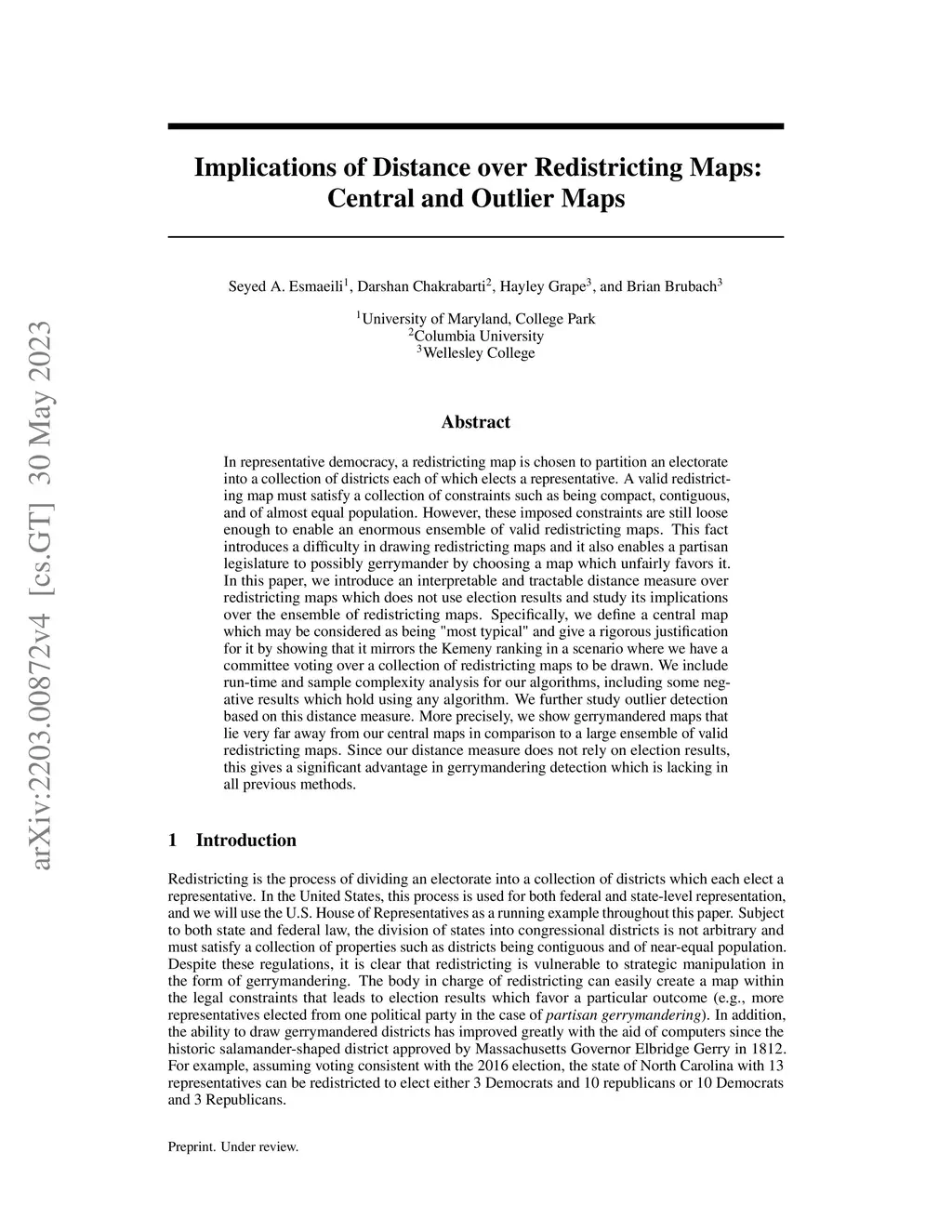 In representative democracy, a redistricting map is chosen to partition an electorate into a collection of districts each of which elects a representative. A valid redistricting map must satisfy a collection of constraints such as being compact, contiguous, and of almost equal population. However, these imposed constraints are still loose enough to enable an enormous ensemble of valid redistricting maps. This fact introduces a difficulty in drawing redistricting maps and it also enables a partisan legislature to possibly gerrymander by choosing a map which unfairly favors it. In this paper, we introduce an interpretable and tractable distance measure over redistricting maps which does not use election results and study its implications over the ensemble of redistricting maps. Specifically, we define a central map which may be considered as being "most typical" and give a rigorous justification for it by showing that it mirrors the Kemeny ranking in a scenario where we have a committee voting over a collection of redistricting maps to be drawn. We include run-time and sample complexity analysis for our algorithms, including some negative results which hold using any algorithm. We further study outlier detection based on this distance measure. More precisely, we show gerrymandered maps that lie very far away from our central maps in comparison to a large ensemble of valid redistricting maps. Since our distance measure does not rely on election results, this gives a significant advantage in gerrymandering detection which is lacking in all previous methods.