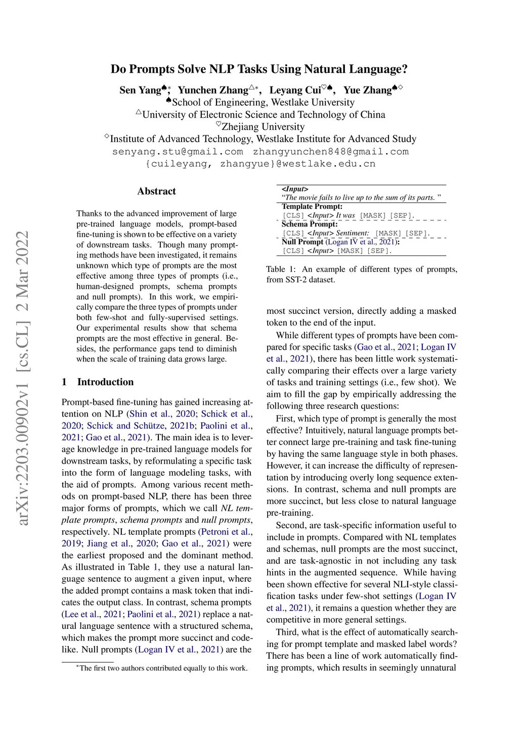 Thanks to the advanced improvement of large pre-trained language models, prompt-based fine-tuning is shown to be effective on a variety of downstream tasks. Though many prompting methods have been investigated, it remains unknown which type of prompts are the most effective among three types of prompts (i.e., human-designed prompts, schema prompts and null prompts). In this work, we empirically compare the three types of prompts under both few-shot and fully-supervised settings. Our experimental results show that schema prompts are the most effective in general. Besides, the performance gaps tend to diminish when the scale of training data grows large.