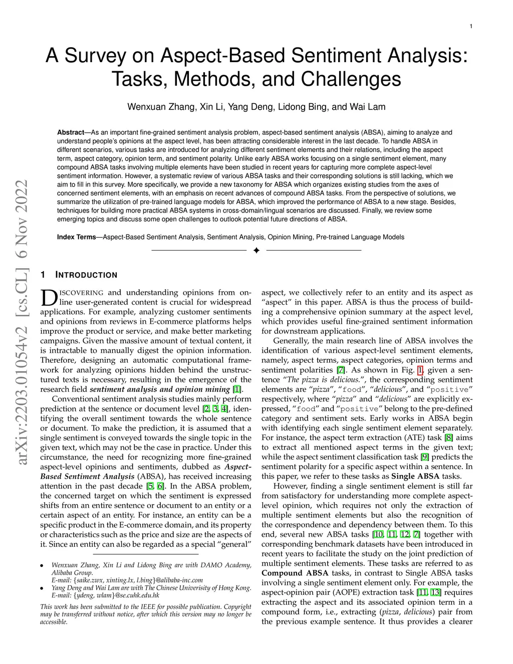 A Survey on Aspect-Based Sentiment Analysis: Tasks, Methods, and