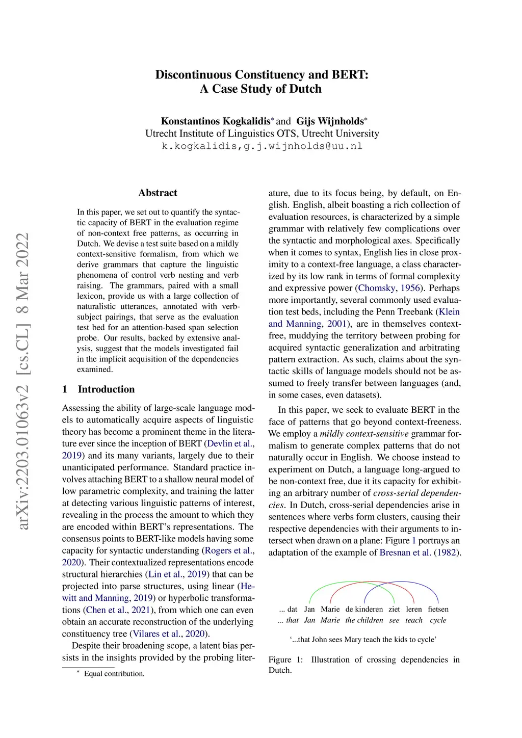 In this paper, we set out to quantify the syntactic capacity of BERT in the evaluation regime of non-context free patterns, as occurring in Dutch. We devise a test suite based on a mildly context-sensitive formalism, from which we derive grammars that capture the linguistic phenomena of control verb nesting and verb raising. The grammars, paired with a small lexicon, provide us with a large collection of naturalistic utterances, annotated with verb-subject pairings, that serve as the evaluation test bed for an attention-based span selection probe. Our results, backed by extensive analysis, suggest that the models investigated fail in the implicit acquisition of the dependencies examined.