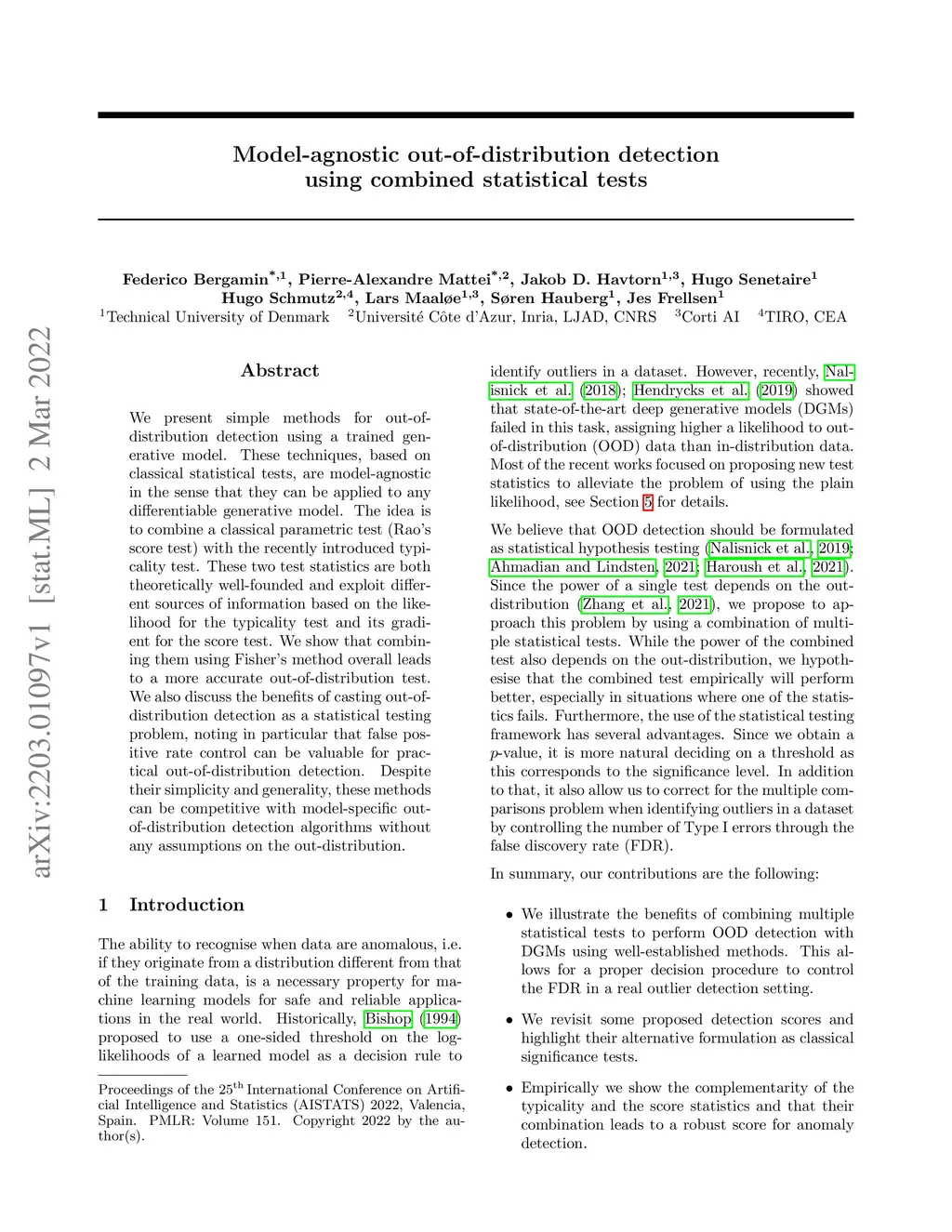 We present simple methods for out-of-distribution detection using a trained generative model. These techniques, based on classical statistical tests, are model-agnostic in the sense that they can be applied to any differentiable generative model. The idea is to combine a classical parametric test (Rao's score test) with the recently introduced typicality test. These two test statistics are both theoretically well-founded and exploit different sources of information based on the likelihood for the typicality test and its gradient for the score test. We show that combining them using Fisher's method overall leads to a more accurate out-of-distribution test. We also discuss the benefits of casting out-of-distribution detection as a statistical testing problem, noting in particular that false positive rate control can be valuable for practical out-of-distribution detection. Despite their simplicity and generality, these methods can be competitive with model-specific out-of-distribution detection algorithms without any assumptions on the out-distribution.