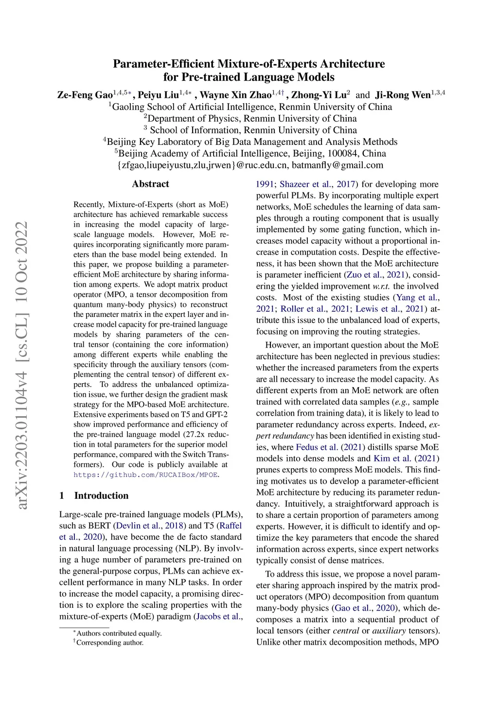 Recently, Mixture-of-Experts (short as MoE) architecture has achieved remarkable success in increasing the model capacity of large-scale language models. However, MoE requires incorporating significantly more parameters than the base model being extended. In this paper, we propose building a parameter-efficient MoE architecture by sharing information among experts. We adopt the matrix product operator (MPO, a tensor decomposition from quantum many-body physics) to reconstruct the parameter matrix in the expert layer and increase model capacity for pre-trained language models by sharing parameters of the central tensor (containing the core information) among different experts while enabling the specificity through the auxiliary tensors (complementing the central tensor) of different experts. To address the unbalanced optimization issue, we further design the gradient mask strategy for the MPO-based MoE architecture. Extensive experiments based on T5 and GPT-2 show improved performance and efficiency of the pre-trained language model (27.2x reduction in total parameters for the superior model performance, compared with the Switch Transformers). Our code is publicly available at https://github.com/RUCAIBox/MPOE.