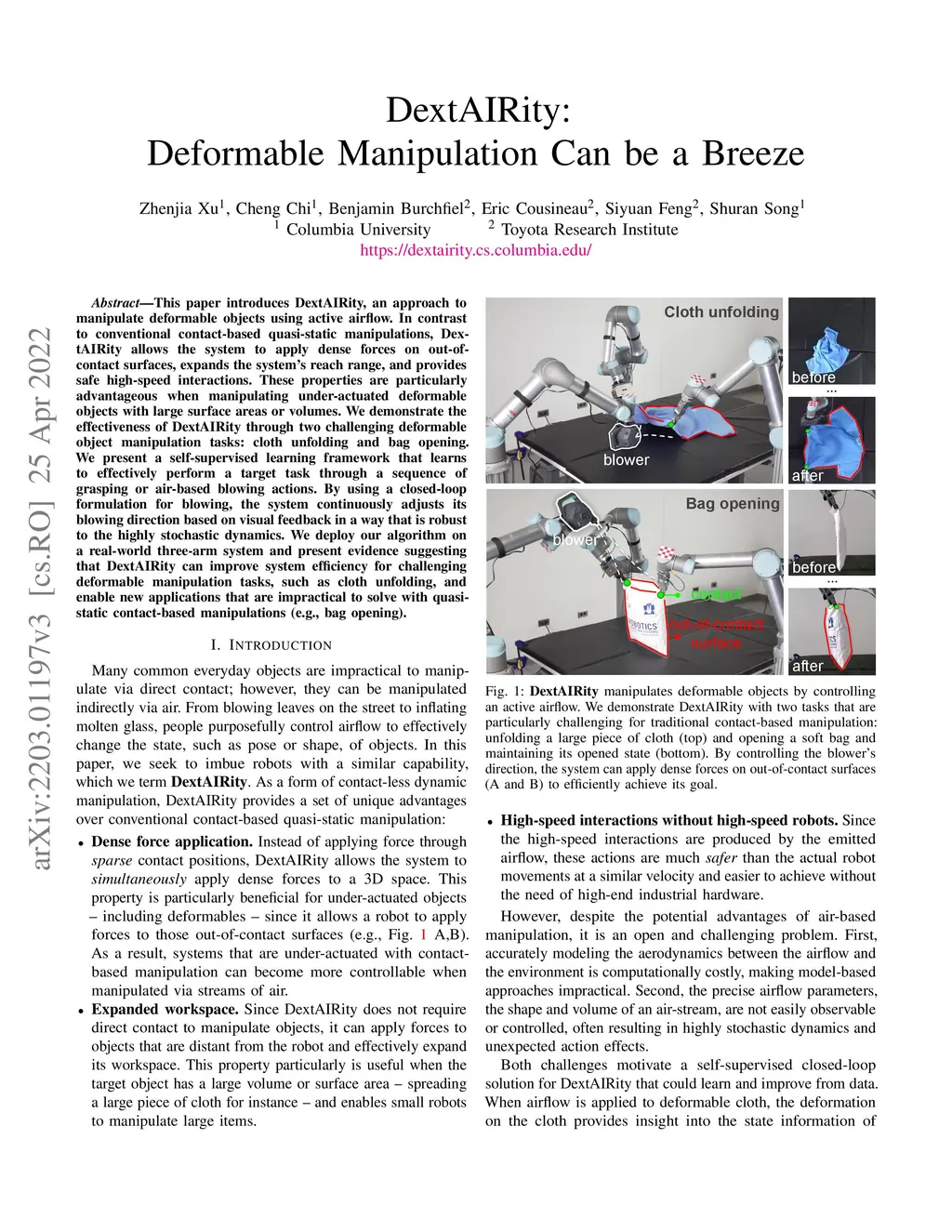 This paper introduces DextAIRity, an approach to manipulate deformable objects using active airflow. In contrast to conventional contact-based quasi-static manipulations, DextAIRity allows the system to apply dense forces on out-of-contact surfaces, expands the system's reach range, and provides safe high-speed interactions. These properties are particularly advantageous when manipulating under-actuated deformable objects with large surface areas or volumes. We demonstrate the effectiveness of DextAIRity through two challenging deformable object manipulation tasks: cloth unfolding and bag opening. We present a self-supervised learning framework that learns to effectively perform a target task through a sequence of grasping or air-based blowing actions. By using a closed-loop formulation for blowing, the system continuously adjusts its blowing direction based on visual feedback in a way that is robust to the highly stochastic dynamics. We deploy our algorithm on a real-world three-arm system and present evidence suggesting that DextAIRity can improve system efficiency for challenging deformable manipulation tasks, such as cloth unfolding, and enable new applications that are impractical to solve with quasi-static contact-based manipulations (e.g., bag opening). Video is available at https://youtu.be/_B0TpAa5tVo