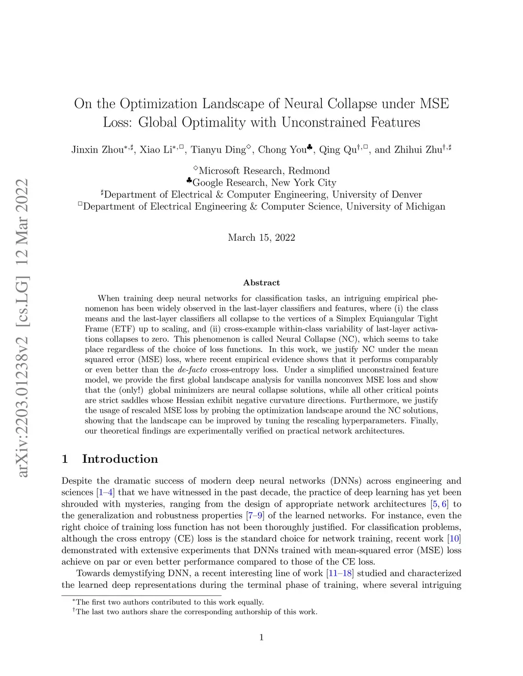 When training deep neural networks for classification tasks, an intriguing empirical phenomenon has been widely observed in the last-layer classifiers and features, where (i) the class means and the last-layer classifiers all collapse to the vertices of a Simplex Equiangular Tight Frame (ETF) up to scaling, and (ii) cross-example within-class variability of last-layer activations collapses to zero. This phenomenon is called Neural Collapse (NC), which seems to take place regardless of the choice of loss functions. In this work, we justify NC under the mean squared error (MSE) loss, where recent empirical evidence shows that it performs comparably or even better than the de-facto cross-entropy loss. Under a simplified unconstrained feature model, we provide the first global landscape analysis for vanilla nonconvex MSE loss and show that the (only!) global minimizers are neural collapse solutions, while all other critical points are strict saddles whose Hessian exhibit negative curvature directions. Furthermore, we justify the usage of rescaled MSE loss by probing the optimization landscape around the NC solutions, showing that the landscape can be improved by tuning the rescaling hyperparameters. Finally, our theoretical findings are experimentally verified on practical network architectures.