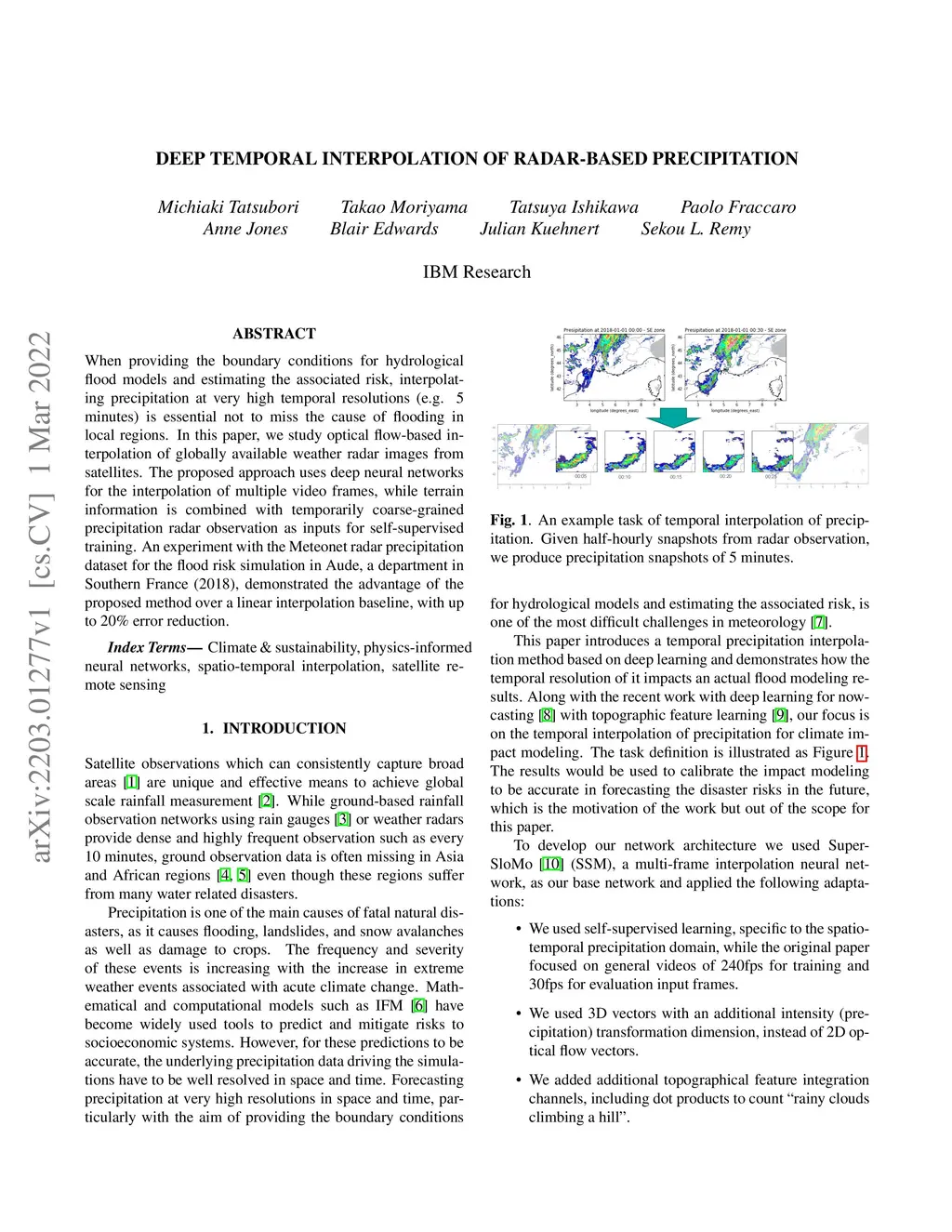 When providing the boundary conditions for hydrological flood models and estimating the associated risk, interpolating precipitation at very high temporal resolutions (e.g. 5 minutes) is essential not to miss the cause of flooding in local regions. In this paper, we study optical flow-based interpolation of globally available weather radar images from satellites. The proposed approach uses deep neural networks for the interpolation of multiple video frames, while terrain information is combined with temporarily coarse-grained precipitation radar observation as inputs for self-supervised training. An experiment with the Meteonet radar precipitation dataset for the flood risk simulation in Aude, a department in Southern France (2018), demonstrated the advantage of the proposed method over a linear interpolation baseline, with up to 20% error reduction.