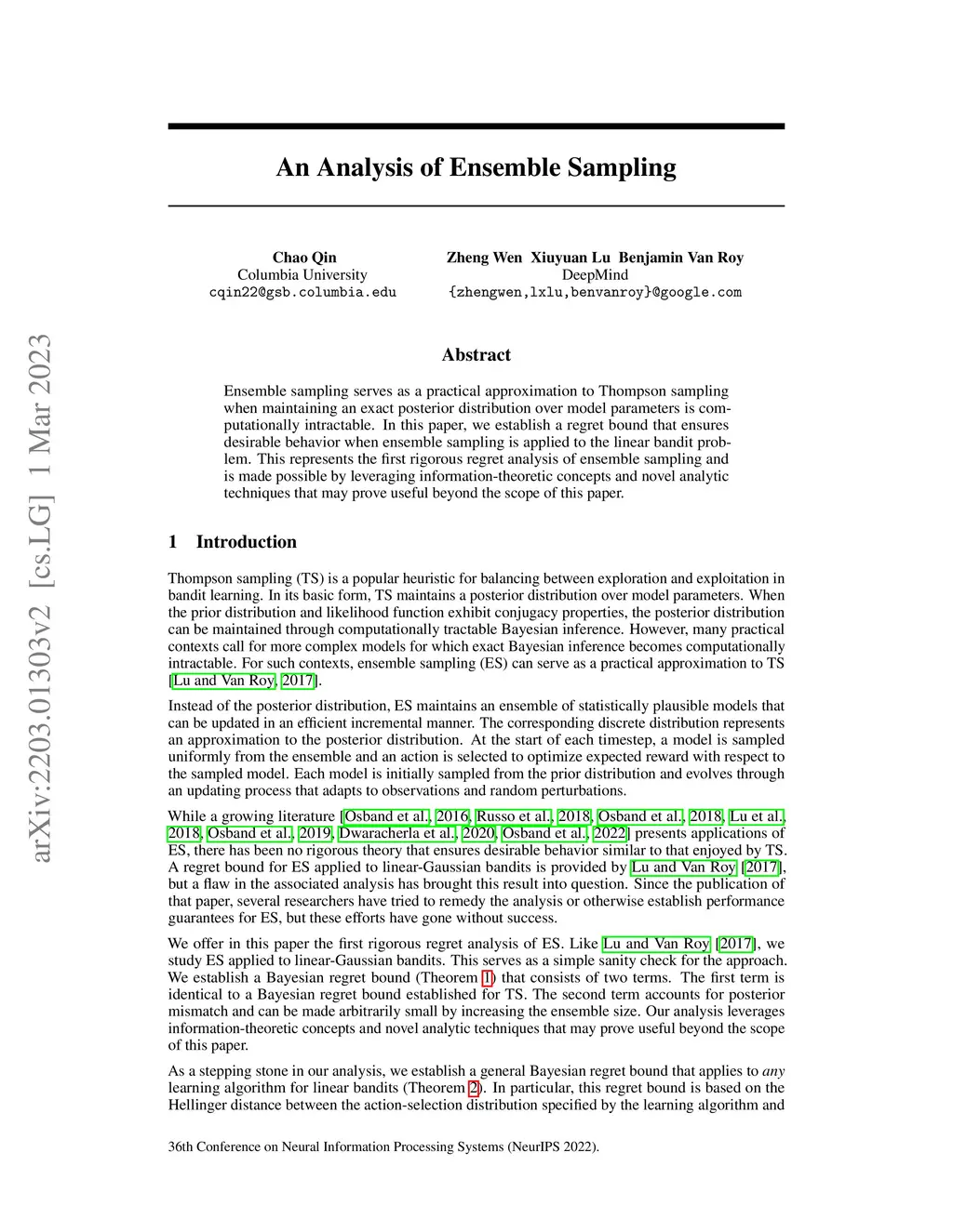 Ensemble sampling serves as a practical approximation to Thompson sampling when maintaining an exact posterior distribution over model parameters is computationally intractable. In this paper, we establish a regret bound that ensures desirable behavior when ensemble sampling is applied to the linear bandit problem. This represents the first rigorous regret analysis of ensemble sampling and is made possible by leveraging information-theoretic concepts and novel analytic techniques that may prove useful beyond the scope of this paper.