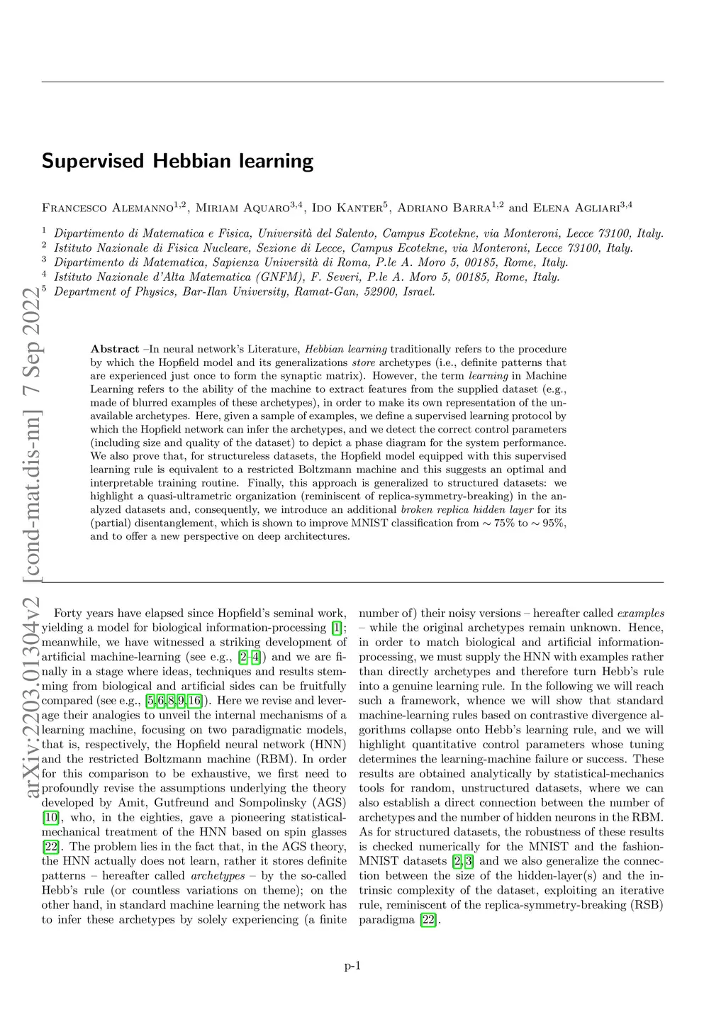 In neural network's Literature, Hebbian learning traditionally refers to the procedure by which the Hopfield model and its generalizations store archetypes (i.e., definite patterns that are experienced just once to form the synaptic matrix). However, the term "Learning" in Machine Learning refers to the ability of the machine to extract features from the supplied dataset (e.g., made of blurred examples of these archetypes), in order to make its own representation of the unavailable archetypes. Here, given a sample of examples, we define a supervised learning protocol by which the Hopfield network can infer the archetypes, and we detect the correct control parameters (including size and quality of the dataset) to depict a phase diagram for the system performance. We also prove that, for structureless datasets, the Hopfield model equipped with this supervised learning rule is equivalent to a restricted Boltzmann machine and this suggests an optimal and interpretable training routine. Finally, this approach is generalized to structured datasets: we highlight a quasi-ultrametric organization (reminiscent of replica-symmetry-breaking) in the analyzed datasets and, consequently, we introduce an additional "replica hidden layer" for its (partial) disentanglement, which is shown to improve MNIST classification from 75% to 95%, and to offer a new perspective on deep architectures.