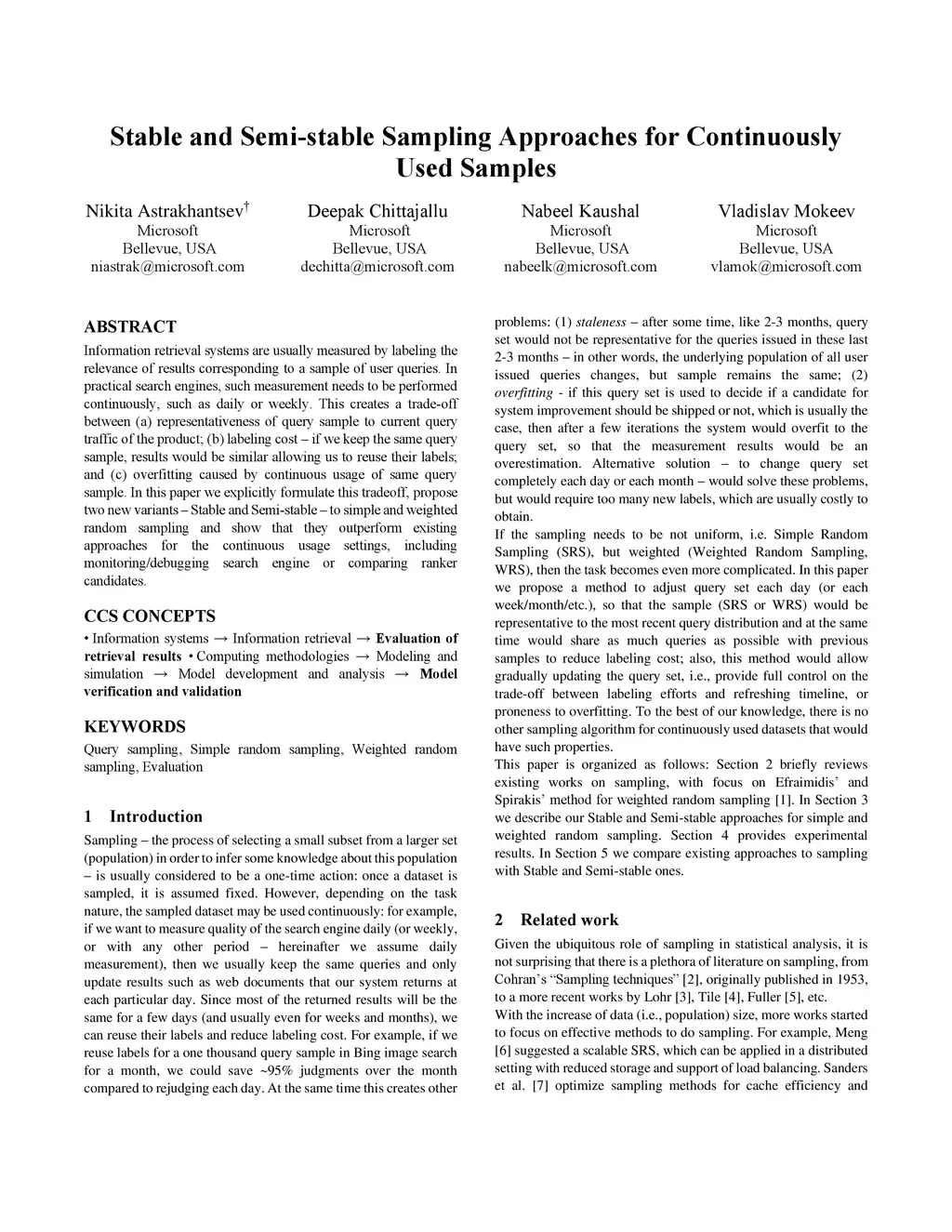 Information retrieval systems are usually measured by labeling the relevance of results corresponding to a sample of user queries. In practical search engines, such measurement needs to be performed continuously, such as daily or weekly. This creates a trade-off between (a) representativeness of query sample to current query traffic of the product; (b) labeling cost: if we keep the same query sample, results would be similar allowing us to reuse their labels; and (c) overfitting caused by continuous usage of same query sample. In this paper we explicitly formulate this tradeoff, propose two new variants -- Stable and Semi-stable -- to simple and weighted random sampling and show that they outperform existing approaches for the continuous usage settings, including monitoring/debugging search engine or comparing ranker candidates.