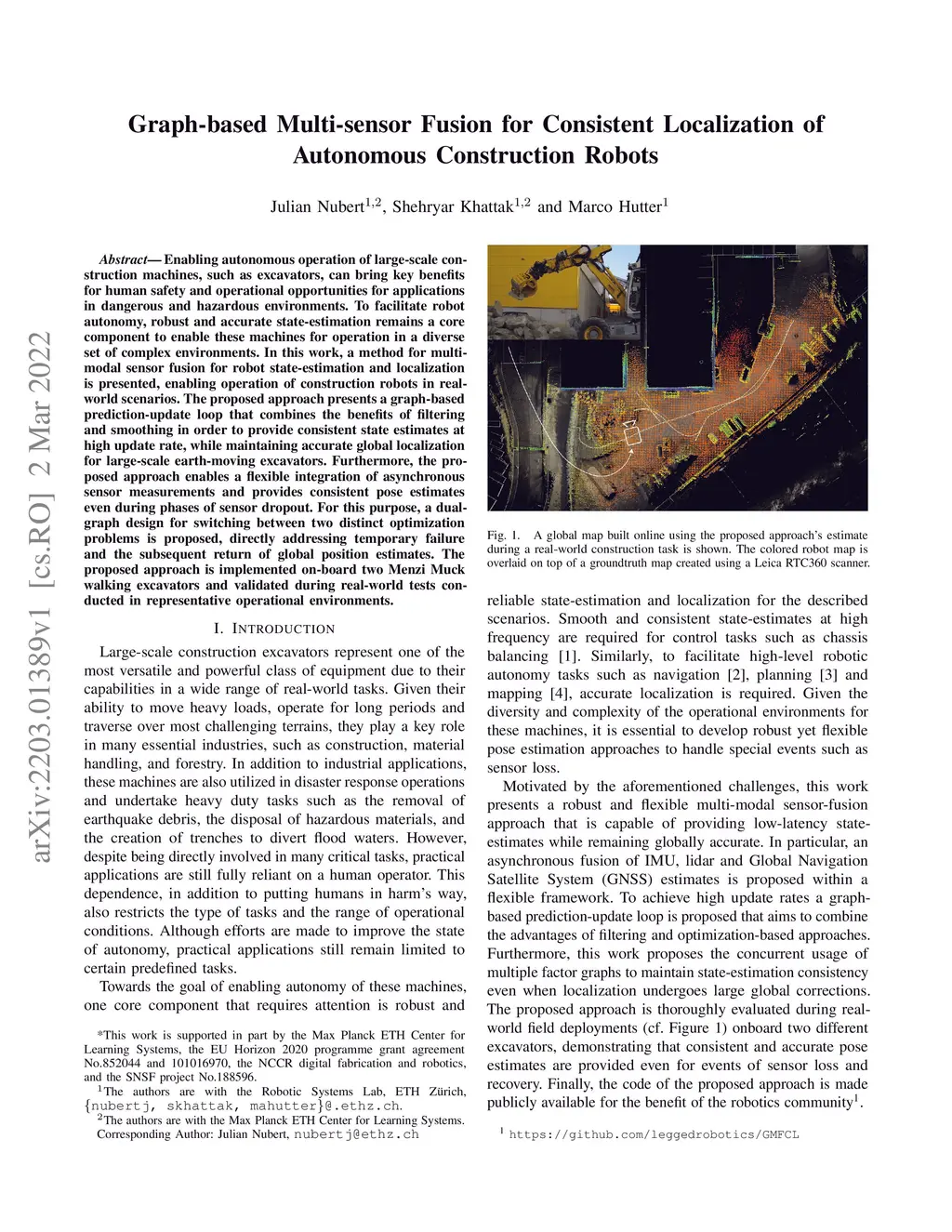 Enabling autonomous operation of large-scale construction machines, such as excavators, can bring key benefits for human safety and operational opportunities for applications in dangerous and hazardous environments. To facilitate robot autonomy, robust and accurate state-estimation remains a core component to enable these machines for operation in a diverse set of complex environments. In this work, a method for multi-modal sensor fusion for robot state-estimation and localization is presented, enabling operation of construction robots in real-world scenarios. The proposed approach presents a graph-based prediction-update loop that combines the benefits of filtering and smoothing in order to provide consistent state estimates at high update rate, while maintaining accurate global localization for large-scale earth-moving excavators. Furthermore, the proposed approach enables a flexible integration of asynchronous sensor measurements and provides consistent pose estimates even during phases of sensor dropout. For this purpose, a dual-graph design for switching between two distinct optimization problems is proposed, directly addressing temporary failure and the subsequent return of global position estimates. The proposed approach is implemented on-board two Menzi Muck walking excavators and validated during real-world tests conducted in representative operational environments.