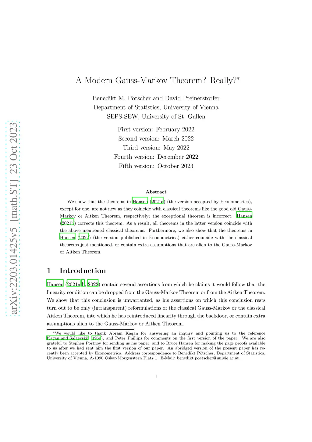 We show that the theorems in Hansen (2021a) (the version accepted by Econometrica), except for one, are not new as they coincide with classical theorems like the good old Gauss-Markov or Aitken Theorem, respectively; the exceptional theorem is incorrect. Hansen (2021b) corrects this theorem. As a result, all theorems in the latter version coincide with the above mentioned classical theorems. Furthermore, we also show that the theorems in Hansen (2022) (the version published in Econometrica) either coincide with the classical theorems just mentioned, or contain extra assumptions that are alien to the Gauss-Markov or Aitken Theorem.