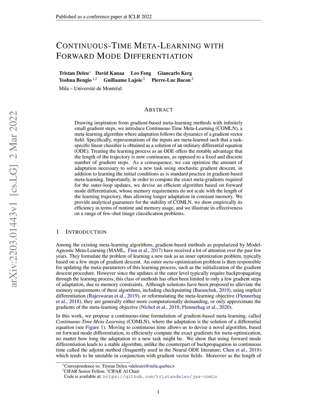 Continuous-Time Meta-Learning with Forward Mode Differentiation