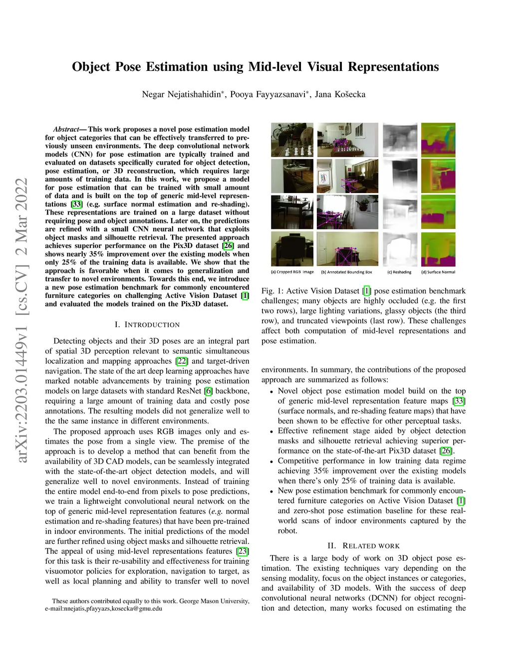 This work proposes a novel pose estimation model for object categories that can be effectively transferred to previously unseen environments. The deep convolutional network models (CNN) for pose estimation are typically trained and evaluated on datasets specifically curated for object detection, pose estimation, or 3D reconstruction, which requires large amounts of training data. In this work, we propose a model for pose estimation that can be trained with small amount of data and is built on the top of generic mid-level representations \cite{taskonomy2018} (e.g. surface normal estimation and re-shading). These representations are trained on a large dataset without requiring pose and object annotations. Later on, the predictions are refined with a small CNN neural network that exploits object masks and silhouette retrieval. The presented approach achieves superior performance on the Pix3D dataset \cite{pix3d} and shows nearly 35\% improvement over the existing models when only 25\% of the training data is available. We show that the approach is favorable when it comes to generalization and transfer to novel environments. Towards this end, we introduce a new pose estimation benchmark for commonly encountered furniture categories on challenging Active Vision Dataset \cite{Ammirato2017ADF} and evaluated the models trained on the Pix3D dataset.