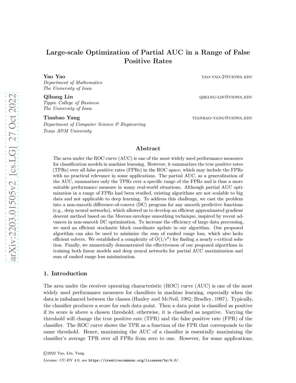 The area under the ROC curve (AUC) is one of the most widely used performance measures for classification models in machine learning. However, it summarizes the true positive rates (TPRs) over all false positive rates (FPRs) in the ROC space, which may include the FPRs with no practical relevance in some applications. The partial AUC, as a generalization of the AUC, summarizes only the TPRs over a specific range of the FPRs and is thus a more suitable performance measure in many real-world situations. Although partial AUC optimization in a range of FPRs had been studied, existing algorithms are not scalable to big data and not applicable to deep learning. To address this challenge, we cast the problem into a non-smooth difference-of-convex (DC) program for any smooth predictive functions (e.g., deep neural networks), which allowed us to develop an efficient approximated gradient descent method based on the Moreau envelope smoothing technique, inspired by recent advances in non-smooth DC optimization. To increase the efficiency of large data processing, we used an efficient stochastic block coordinate update in our algorithm. Our proposed algorithm can also be used to minimize the sum of ranked range loss, which also lacks efficient solvers. We established a complexity of for finding a nearly -critical solution. Finally, we numerically demonstrated the effectiveness of our proposed algorithms for both partial AUC maximization and sum of ranked range loss minimization.