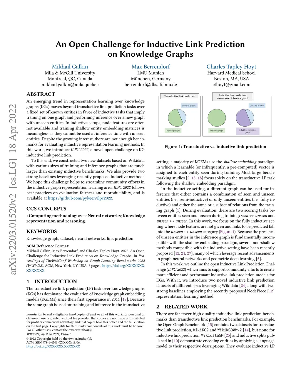 An emerging trend in representation learning over knowledge graphs (KGs) moves beyond transductive link prediction tasks over a fixed set of known entities in favor of inductive tasks that imply training on one graph and performing inference over a new graph with unseen entities. In inductive setups, node features are often not available and training shallow entity embedding matrices is meaningless as they cannot be used at inference time with unseen entities. Despite the growing interest, there are not enough benchmarks for evaluating inductive representation learning methods. In this work, we introduce ILPC 2022, a novel open challenge on KG inductive link prediction. To this end, we constructed two new datasets based on Wikidata with various sizes of training and inference graphs that are much larger than existing inductive benchmarks. We also provide two strong baselines leveraging recently proposed inductive methods. We hope this challenge helps to streamline community efforts in the inductive graph representation learning area. ILPC 2022 follows best practices on evaluation fairness and reproducibility, and is available at https://github.com/pykeen/ilpc2022.