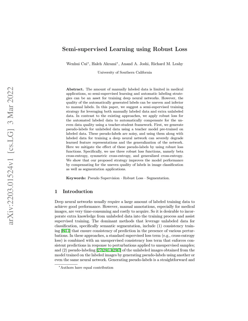 The amount of manually labeled data is limited in medical applications, so semi-supervised learning and automatic labeling strategies can be an asset for training deep neural networks. However, the quality of the automatically generated labels can be uneven and inferior to manual labels. In this paper, we suggest a semi-supervised training strategy for leveraging both manually labeled data and extra unlabeled data. In contrast to the existing approaches, we apply robust loss for the automated labeled data to automatically compensate for the uneven data quality using a teacher-student framework. First, we generate pseudo-labels for unlabeled data using a teacher model pre-trained on labeled data. These pseudo-labels are noisy, and using them along with labeled data for training a deep neural network can severely degrade learned feature representations and the generalization of the network. Here we mitigate the effect of these pseudo-labels by using robust loss functions. Specifically, we use three robust loss functions, namely beta cross-entropy, symmetric cross-entropy, and generalized cross-entropy. We show that our proposed strategy improves the model performance by compensating for the uneven quality of labels in image classification as well as segmentation applications.