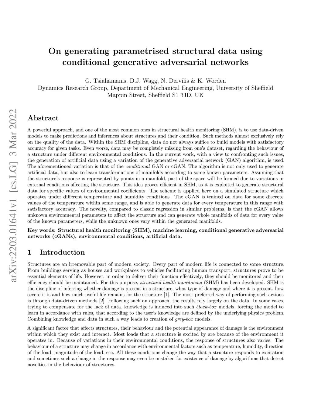 A powerful approach, and one of the most common ones in structural health monitoring (SHM), is to use data-driven models to make predictions and inferences about structures and their condition. Such methods almost exclusively rely on the quality of the data. Within the SHM discipline, data do not always suffice to build models with satisfactory accuracy for given tasks. Even worse, data may be completely missing from one's dataset, regarding the behaviour of a structure under different environmental conditions. In the current work, with a view to confronting such issues, the generation of artificial data using a variation of the generative adversarial network (GAN) algorithm, is used. The aforementioned variation is that of the conditional GAN or cGAN. The algorithm is not only used to generate artificial data, but also to learn transformations of manifolds according to some known parameters. Assuming that the structure's response is represented by points in a manifold, part of the space will be formed due to variations in external conditions affecting the structure. This idea proves efficient in SHM, as it is exploited to generate structural data for specific values of environmental coefficients. The scheme is applied here on a simulated structure which operates under different temperature and humidity conditions. The cGAN is trained on data for some discrete values of the temperature within some range, and is able to generate data for every temperature in this range with satisfactory accuracy. The novelty, compared to classic regression in similar problems, is that the cGAN allows unknown environmental parameters to affect the structure and can generate whole manifolds of data for every value of the known parameters, while the unknown ones vary within the generated manifolds.