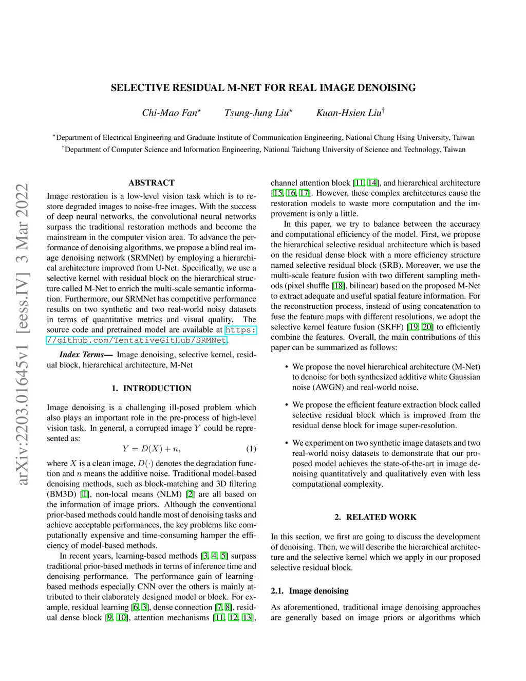 Image restoration is a low-level vision task which is to restore degraded images to noise-free images. With the success of deep neural networks, the convolutional neural networks surpass the traditional restoration methods and become the mainstream in the computer vision area. To advance the performanceof denoising algorithms, we propose a blind real image denoising network (SRMNet) by employing a hierarchical architecture improved from U-Net. Specifically, we use a selective kernel with residual block on the hierarchical structure called M-Net to enrich the multi-scale semantic information. Furthermore, our SRMNet has competitive performance results on two synthetic and two real-world noisy datasets in terms of quantitative metrics and visual quality. The source code and pretrained model are available at https://github.com/TentativeGitHub/SRMNet.