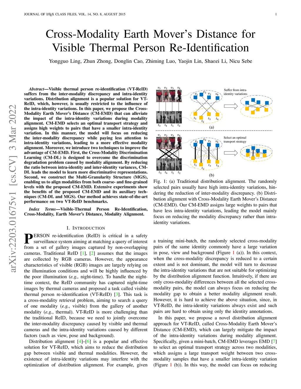 Visible thermal person re-identification (VT-ReID) suffers from the inter-modality discrepancy and intra-identity variations. Distribution alignment is a popular solution for VT-ReID, which, however, is usually restricted to the influence of the intra-identity variations. In this paper, we propose the Cross-Modality Earth Mover's Distance (CM-EMD) that can alleviate the impact of the intra-identity variations during modality alignment. CM-EMD selects an optimal transport strategy and assigns high weights to pairs that have a smaller intra-identity variation. In this manner, the model will focus on reducing the inter-modality discrepancy while paying less attention to intra-identity variations, leading to a more effective modality alignment. Moreover, we introduce two techniques to improve the advantage of CM-EMD. First, the Cross-Modality Discrimination Learning (CM-DL) is designed to overcome the discrimination degradation problem caused by modality alignment. By reducing the ratio between intra-identity and inter-identity variances, CM-DL leads the model to learn more discriminative representations. Second, we construct the Multi-Granularity Structure (MGS), enabling us to align modalities from both coarse- and fine-grained levels with the proposed CM-EMD. Extensive experiments show the benefits of the proposed CM-EMD and its auxiliary techniques (CM-DL and MGS). Our method achieves state-of-the-art performance on two VT-ReID benchmarks.