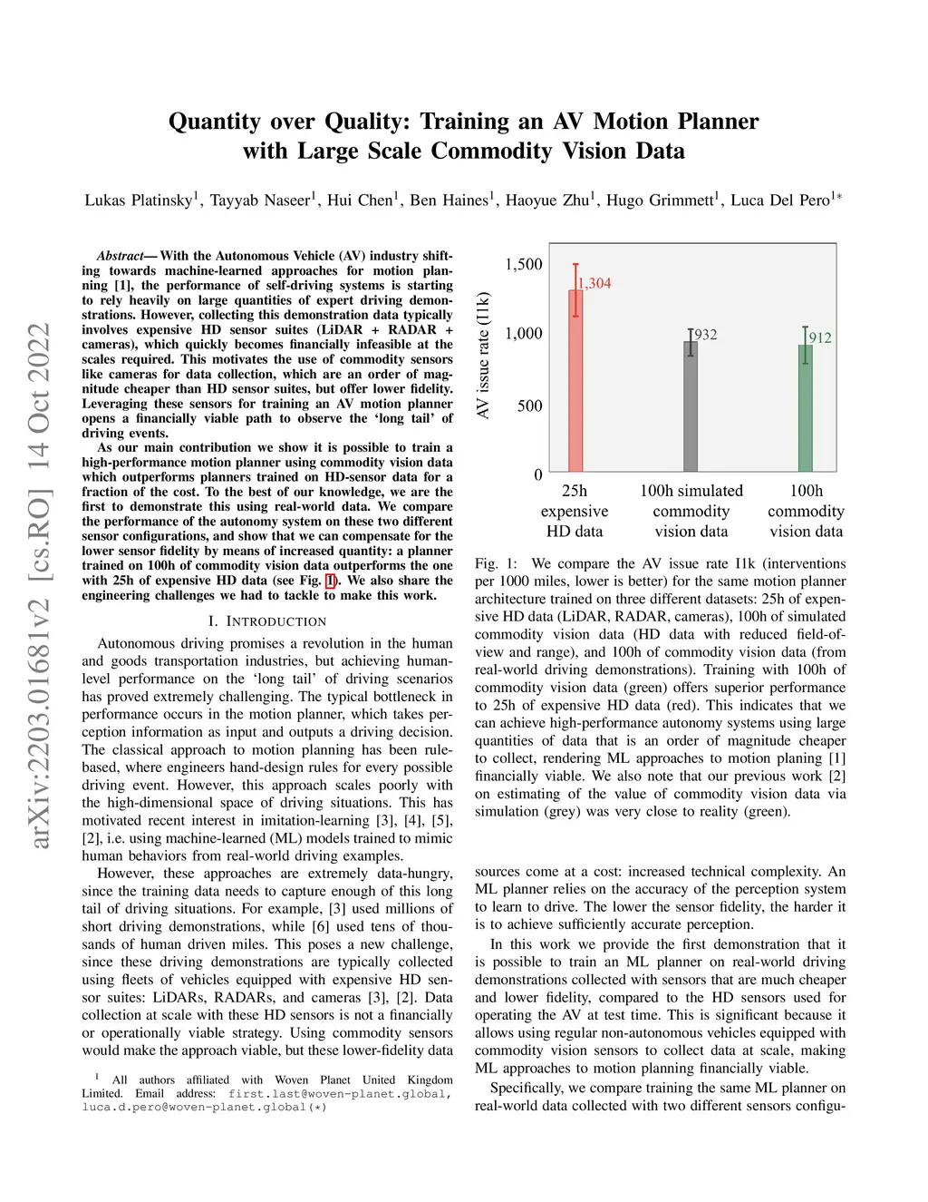 With the Autonomous Vehicle (AV) industry shifting towards machine-learned approaches for motion planning, the performance of self-driving systems is starting to rely heavily on large quantities of expert driving demonstrations. However, collecting this demonstration data typically involves expensive HD sensor suites (LiDAR + RADAR + cameras), which quickly becomes financially infeasible at the scales required. This motivates the use of commodity sensors like cameras for data collection, which are an order of magnitude cheaper than HD sensor suites, but offer lower fidelity. Leveraging these sensors for training an AV motion planner opens a financially viable path to observe the `long tail' of driving events. As our main contribution we show it is possible to train a high-performance motion planner using commodity vision data which outperforms planners trained on HD-sensor data for a fraction of the cost. To the best of our knowledge, we are the first to demonstrate this using real-world data. We compare the performance of the autonomy system on these two different sensor configurations, and show that we can compensate for the lower sensor fidelity by means of increased quantity: a planner trained on 100h of commodity vision data outperforms the one with 25h of expensive HD data. We also share the engineering challenges we had to tackle to make this work.