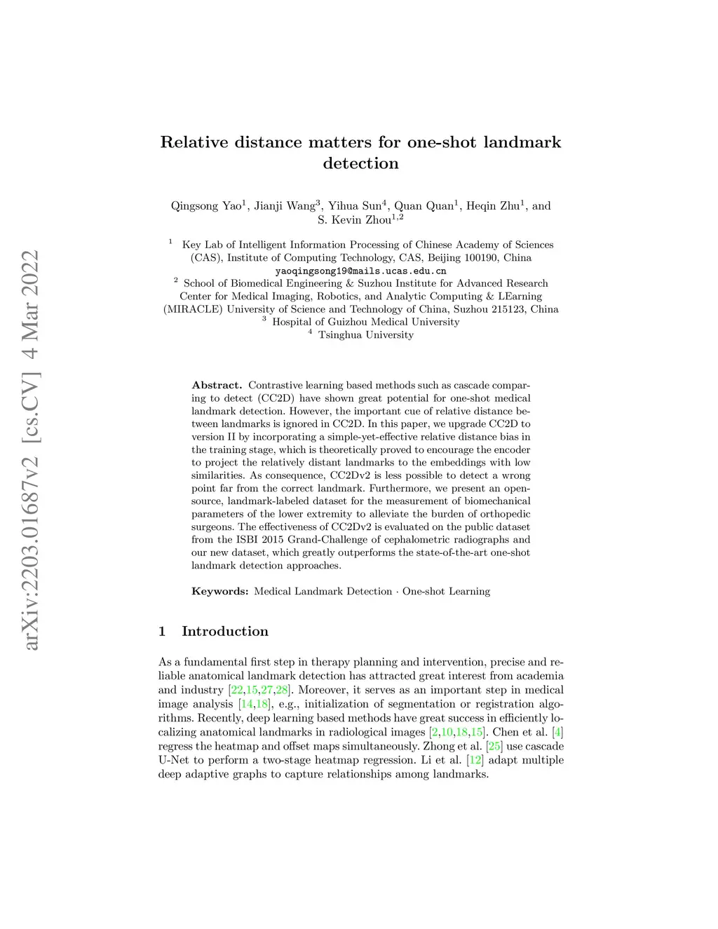 Contrastive learning based methods such as cascade comparing to detect (CC2D) have shown great potential for one-shot medical landmark detection. However, the important cue of relative distance between landmarks is ignored in CC2D. In this paper, we upgrade CC2D to version II by incorporating a simple-yet-effective relative distance bias in the training stage, which is theoretically proved to encourage the encoder to project the relatively distant landmarks to the embeddings with low similarities. As consequence, CC2Dv2 is less possible to detect a wrong point far from the correct landmark. Furthermore, we present an open-source, landmark-labeled dataset for the measurement of biomechanical parameters of the lower extremity to alleviate the burden of orthopedic surgeons. The effectiveness of CC2Dv2 is evaluated on the public dataset from the ISBI 2015 Grand-Challenge of cephalometric radiographs and our new dataset, which greatly outperforms the state-of-the-art one-shot landmark detection approaches.