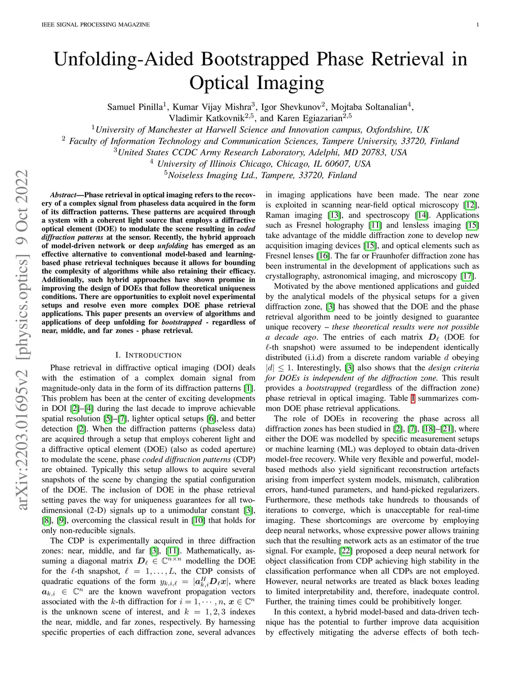 Phase retrieval in optical imaging refers to the recovery of a complex signal from phaseless data acquired in the form of its diffraction patterns. These patterns are acquired through a system with a coherent light source that employs a diffractive optical element (DOE) to modulate the scene resulting in coded diffraction patterns at the sensor. Recently, the hybrid approach of model-driven network or deep unfolding has emerged as an effective alternative to conventional model-based and learning-based phase retrieval techniques because it allows for bounding the complexity of algorithms while also retaining their efficacy. Additionally, such hybrid approaches have shown promise in improving the design of DOEs that follow theoretical uniqueness conditions. There are opportunities to exploit novel experimental setups and resolve even more complex DOE phase retrieval applications. This paper presents an overview of algorithms and applications of deep unfolding for bootstrapped - regardless of near, middle, and far zones - phase retrieval.