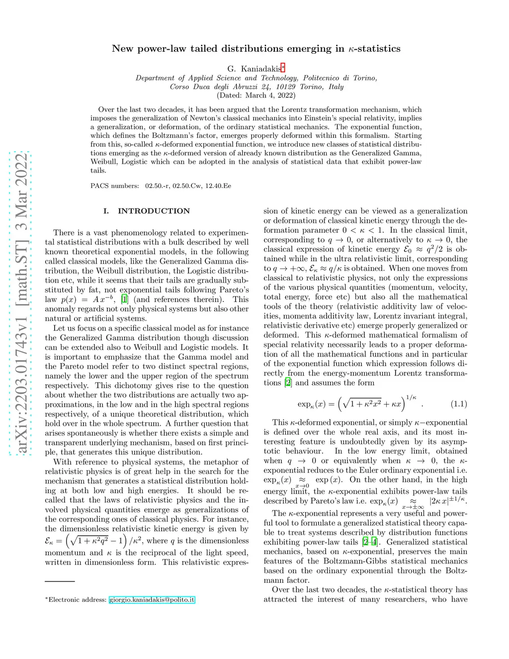 Over the last two decades, it has been argued that the Lorentz transformation mechanism, which imposes the generalization of Newton's classical mechanics into Einstein's special relativity, implies a generalization, or deformation, of the ordinary statistical mechanics. The exponential function, which defines the Boltzmann's factor, emerges properly deformed within this formalism. Starting from this, so-called -deformed exponential function, we introduce new classes of statistical distributions emerging as the -deformed version of already known distribution as the Generalized Gamma, Weibull, Logistic which can be adopted in the analysis of statistical data that exhibit power-law tails.