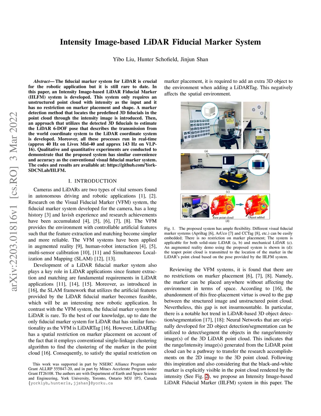 The fiducial marker system for LiDAR is crucial for the robotic application but it is still rare to date. In this paper, an Intensity Image-based LiDAR Fiducial Marker (IILFM) system is developed. This system only requires an unstructured point cloud with intensity as the input and it has no restriction on marker placement and shape. A marker detection method that locates the predefined 3D fiducials in the point cloud through the intensity image is introduced. Then, an approach that utilizes the detected 3D fiducials to estimate the LiDAR 6-DOF pose that describes the transmission from the world coordinate system to the LiDAR coordinate system is developed. Moreover, all these processes run in real-time (approx 40 Hz on Livox Mid-40 and approx 143 Hz on VLP-16). Qualitative and quantitative experiments are conducted to demonstrate that the proposed system has similar convenience and accuracy as the conventional visual fiducial marker system. The codes and results are available at: https://github.com/York-SDCNLab/IILFM.