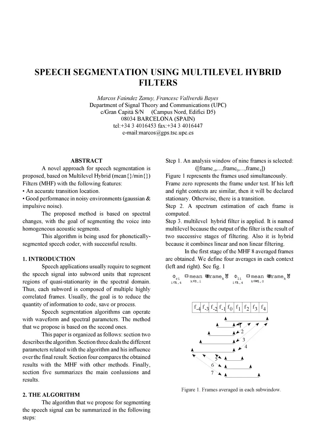 A novel approach for speech segmentation is proposed, based on Multilevel Hybrid (mean/min) Filters (MHF) with the following features: An accurate transition location. Good performance in noisy environments (gaussian and impulsive noise). The proposed method is based on spectral changes, with the goal of segmenting the voice into homogeneous acoustic segments. This algorithm is being used for phoneticallysegmented speech coder, with successful results.
