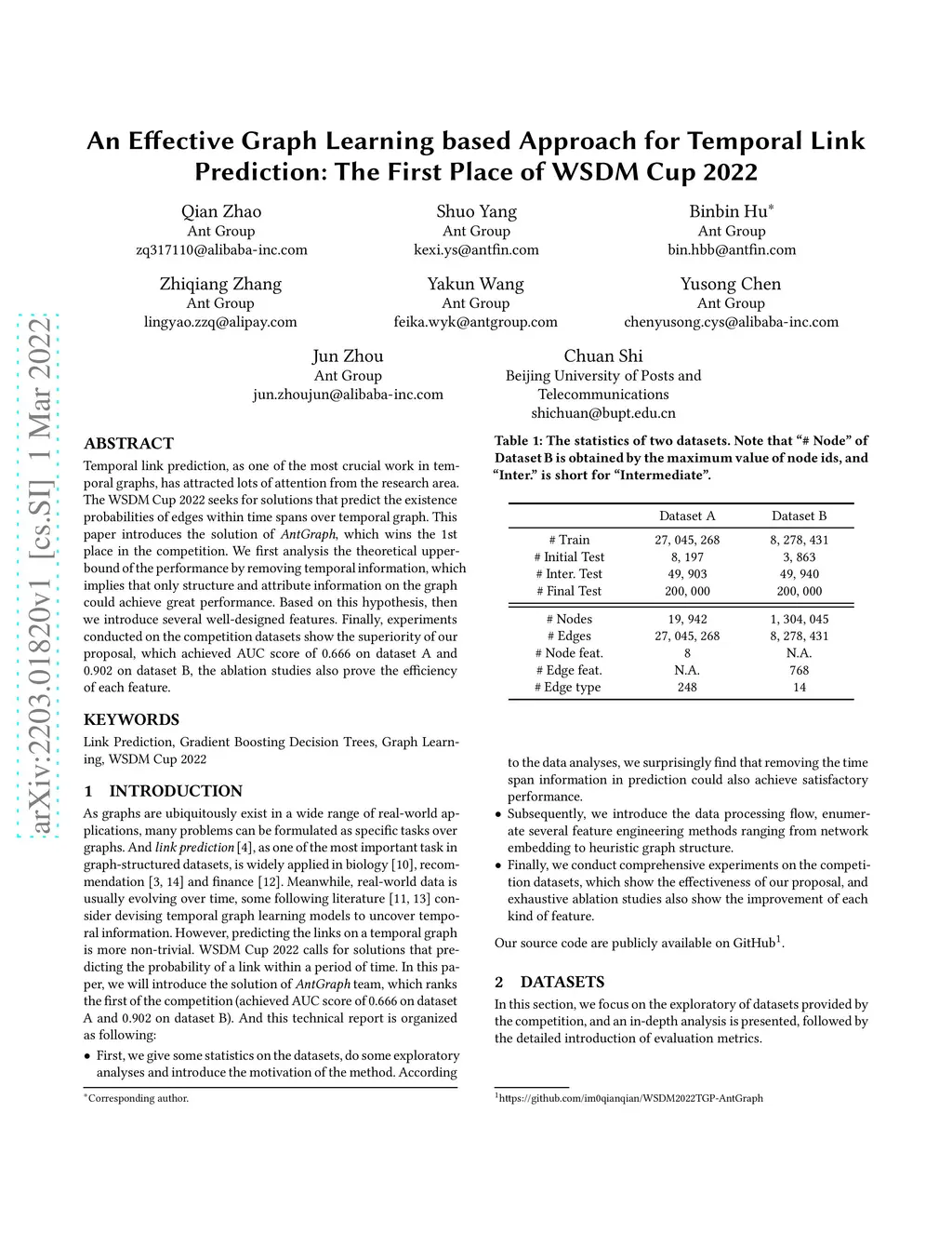 Temporal link prediction, as one of the most crucial work in temporal graphs, has attracted lots of attention from the research area. The WSDM Cup 2022 seeks for solutions that predict the existence probabilities of edges within time spans over temporal graph. This paper introduces the solution of AntGraph, which wins the 1st place in the competition. We first analysis the theoretical upper-bound of the performance by removing temporal information, which implies that only structure and attribute information on the graph could achieve great performance. Based on this hypothesis, then we introduce several well-designed features. Finally, experiments conducted on the competition datasets show the superiority of our proposal, which achieved AUC score of 0.666 on dataset A and 0.902 on dataset B, the ablation studies also prove the efficiency of each feature. Code is publicly available at https://github.com/im0qianqian/WSDM2022TGP-AntGraph.