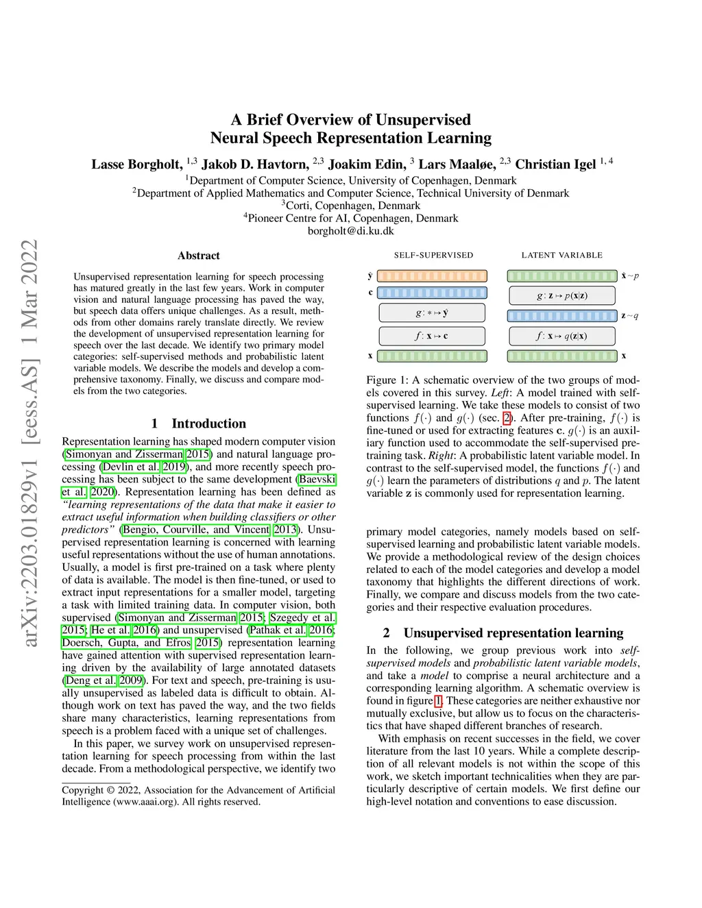 Unsupervised representation learning for speech processing has matured greatly in the last few years. Work in computer vision and natural language processing has paved the way, but speech data offers unique challenges. As a result, methods from other domains rarely translate directly. We review the development of unsupervised representation learning for speech over the last decade. We identify two primary model categories: self-supervised methods and probabilistic latent variable models. We describe the models and develop a comprehensive taxonomy. Finally, we discuss and compare models from the two categories.