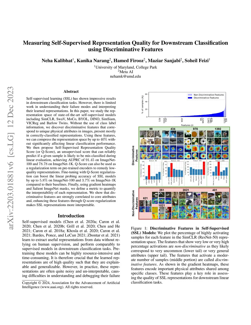 Self-supervised learning (SSL) has shown impressive results in downstream classification tasks. However, there is limited work in understanding their failure modes and interpreting their learned representations. In this paper, we study the representation space of state-of-the-art self-supervised models including SimCLR, SwaV, MoCo, BYOL, DINO, SimSiam, VICReg and Barlow Twins. Without the use of class label information, we discover discriminative features that correspond to unique physical attributes in images, present mostly in correctly-classified representations. Using these features, we can compress the representation space by up to 40% without significantly affecting linear classification performance. We then propose Self-Supervised Representation Quality Score (or Q-Score), an unsupervised score that can reliably predict if a given sample is likely to be mis-classified during linear evaluation, achieving AUPRC of 91.45 on ImageNet-100 and 78.78 on ImageNet-1K. Q-Score can also be used as a regularization term on pre-trained encoders to remedy low-quality representations. Fine-tuning with Q-Score regularization can boost the linear probing accuracy of SSL models by up to 5.8% on ImageNet-100 and 3.7% on ImageNet-1K compared to their baselines. Finally, using gradient heatmaps and Salient ImageNet masks, we define a metric to quantify the interpretability of each representation. We show that discriminative features are strongly correlated to core attributes and, enhancing these features through Q-score regularization makes SSL representations more interpretable.