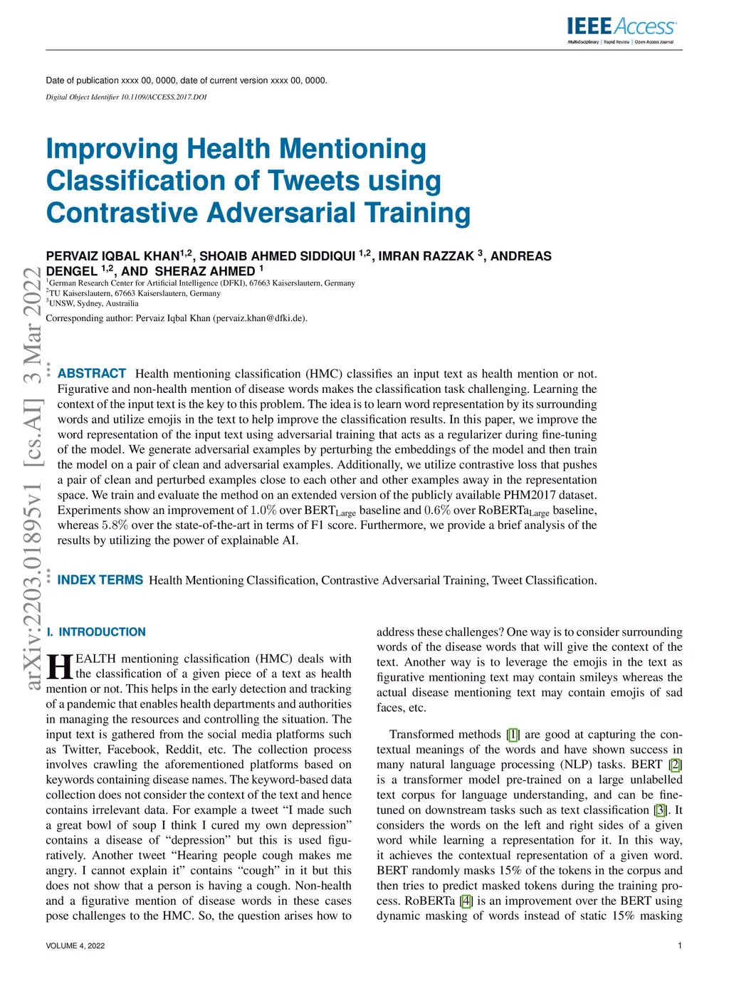 Health mentioning classification (HMC) classifies an input text as health mention or not. Figurative and non-health mention of disease words makes the classification task challenging. Learning the context of the input text is the key to this problem. The idea is to learn word representation by its surrounding words and utilize emojis in the text to help improve the classification results. In this paper, we improve the word representation of the input text using adversarial training that acts as a regularizer during fine-tuning of the model. We generate adversarial examples by perturbing the embeddings of the model and then train the model on a pair of clean and adversarial examples. Additionally, we utilize contrastive loss that pushes a pair of clean and perturbed examples close to each other and other examples away in the representation space. We train and evaluate the method on an extended version of the publicly available PHM2017 dataset. Experiments show an improvement of 1.0% over BERT-Large baseline and 0.6% over RoBERTa-Large baseline, whereas 5.8% over the state-of-the-art in terms of F1 score. Furthermore, we provide a brief analysis of the results by utilizing the power of explainable AI.