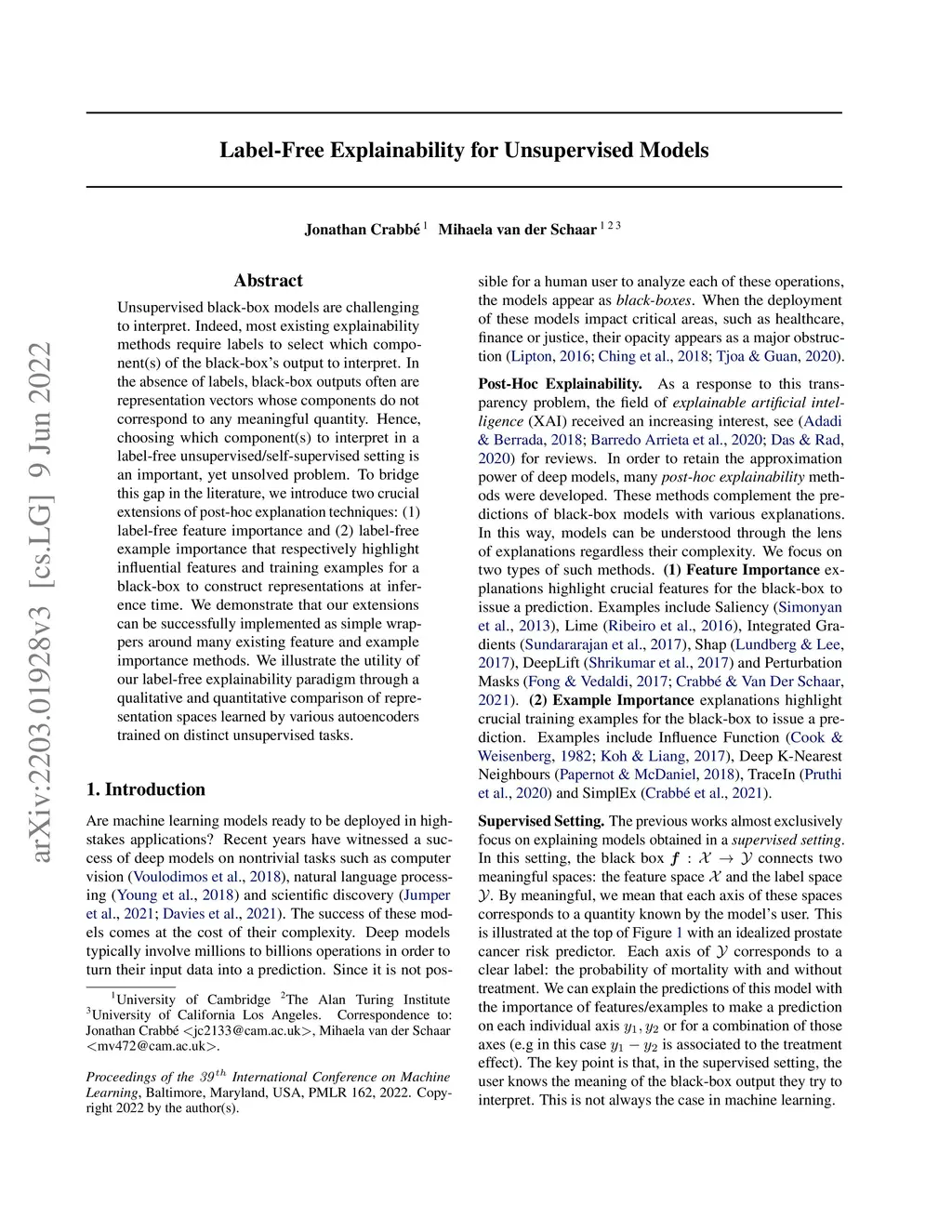 Unsupervised black-box models are challenging to interpret. Indeed, most existing explainability methods require labels to select which component(s) of the black-box's output to interpret. In the absence of labels, black-box outputs often are representation vectors whose components do not correspond to any meaningful quantity. Hence, choosing which component(s) to interpret in a label-free unsupervised/self-supervised setting is an important, yet unsolved problem. To bridge this gap in the literature, we introduce two crucial extensions of post-hoc explanation techniques: (1) label-free feature importance and (2) label-free example importance that respectively highlight influential features and training examples for a black-box to construct representations at inference time. We demonstrate that our extensions can be successfully implemented as simple wrappers around many existing feature and example importance methods. We illustrate the utility of our label-free explainability paradigm through a qualitative and quantitative comparison of representation spaces learned by various autoencoders trained on distinct unsupervised tasks.