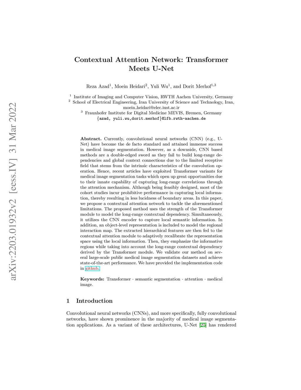 Currently, convolutional neural networks (CNN) (e.g., U-Net) have become the de facto standard and attained immense success in medical image segmentation. However, as a downside, CNN based methods are a double-edged sword as they fail to build long-range dependencies and global context connections due to the limited receptive field that stems from the intrinsic characteristics of the convolution operation. Hence, recent articles have exploited Transformer variants for medical image segmentation tasks which open up great opportunities due to their innate capability of capturing long-range correlations through the attention mechanism. Although being feasibly designed, most of the cohort studies incur prohibitive performance in capturing local information, thereby resulting in less lucidness of boundary areas. In this paper, we propose a contextual attention network to tackle the aforementioned limitations. The proposed method uses the strength of the Transformer module to model the long-range contextual dependency. Simultaneously, it utilizes the CNN encoder to capture local semantic information. In addition, an object-level representation is included to model the regional interaction map. The extracted hierarchical features are then fed to the contextual attention module to adaptively recalibrate the representation space using the local information. Then, they emphasize the informative regions while taking into account the long-range contextual dependency derived by the Transformer module. We validate our method on several large-scale public medical image segmentation datasets and achieve state-of-the-art performance. We have provided the implementation code in https://github.com/rezazad68/TMUnet.