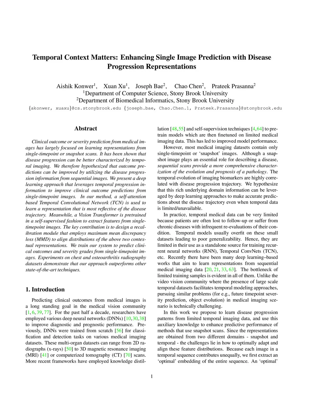 Clinical outcome or severity prediction from medical images has largely focused on learning representations from single-timepoint or snapshot scans. It has been shown that disease progression can be better characterized by temporal imaging. We therefore hypothesized that outcome predictions can be improved by utilizing the disease progression information from sequential images. We present a deep learning approach that leverages temporal progression information to improve clinical outcome predictions from single-timepoint images. In our method, a self-attention based Temporal Convolutional Network (TCN) is used to learn a representation that is most reflective of the disease trajectory. Meanwhile, a Vision Transformer is pretrained in a self-supervised fashion to extract features from single-timepoint images. The key contribution is to design a recalibration module that employs maximum mean discrepancy loss (MMD) to align distributions of the above two contextual representations. We train our system to predict clinical outcomes and severity grades from single-timepoint images. Experiments on chest and osteoarthritis radiography datasets demonstrate that our approach outperforms other state-of-the-art techniques.