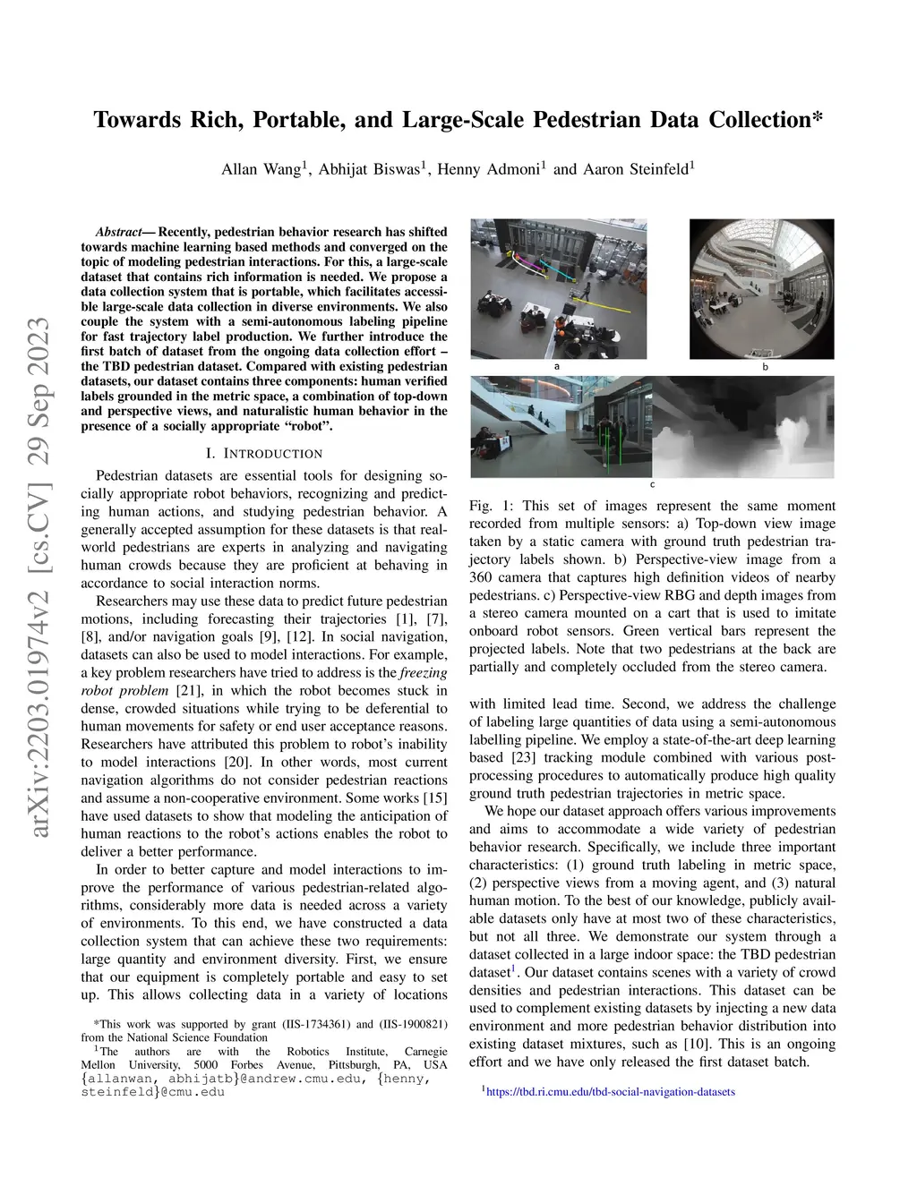 Recently, pedestrian behavior research has shifted towards machine learning based methods and converged on the topic of modeling pedestrian interactions. For this, a large-scale dataset that contains rich information is needed. We propose a data collection system that is portable, which facilitates accessible large-scale data collection in diverse environments. We also couple the system with a semi-autonomous labeling pipeline for fast trajectory label production. We further introduce the first batch of dataset from the ongoing data collection effort -- the TBD pedestrian dataset. Compared with existing pedestrian datasets, our dataset contains three components: human verified labels grounded in the metric space, a combination of top-down and perspective views, and naturalistic human behavior in the presence of a socially appropriate "robot".