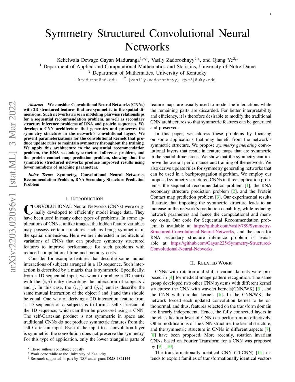 We consider Convolutional Neural Networks (CNNs) with 2D structured features that are symmetric in the spatial dimensions. Such networks arise in modeling pairwise relationships for a sequential recommendation problem, as well as secondary structure inference problems of RNA and protein sequences. We develop a CNN architecture that generates and preserves the symmetry structure in the network's convolutional layers. We present parameterizations for the convolutional kernels that produce update rules to maintain symmetry throughout the training. We apply this architecture to the sequential recommendation problem, the RNA secondary structure inference problem, and the protein contact map prediction problem, showing that the symmetric structured networks produce improved results using fewer numbers of machine parameters.