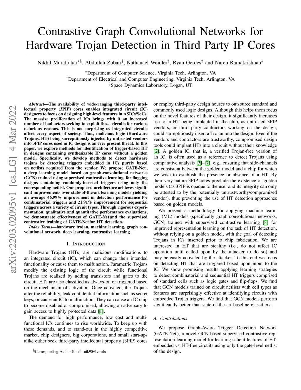 The availability of wide-ranging third-party intellectual property (3PIP) cores enables integrated circuit (IC) designers to focus on designing high-level features in ASICs/SoCs. The massive proliferation of ICs brings with it an increased number of bad actors seeking to exploit those circuits for various nefarious reasons. This is not surprising as integrated circuits affect every aspect of society. Thus, malicious logic (Hardware Trojans, HT) being surreptitiously injected by untrusted vendors into 3PIP cores used in IC design is an ever present threat. In this paper, we explore methods for identification of trigger-based HT in designs containing synthesizable IP cores without a golden model. Specifically, we develop methods to detect hardware trojans by detecting triggers embedded in ICs purely based on netlists acquired from the vendor. We propose GATE-Net, a deep learning model based on graph-convolutional networks (GCN) trained using supervised contrastive learning, for flagging designs containing randomly-inserted triggers using only the corresponding netlist. Our proposed architecture achieves significant improvements over state-of-the-art learning models yielding an average 46.99% improvement in detection performance for combinatorial triggers and 21.91% improvement for sequential triggers across a variety of circuit types. Through rigorous experimentation, qualitative and quantitative performance evaluations, we demonstrate effectiveness of GATE-Net and the supervised contrastive training of GATE-Net for HT detection.