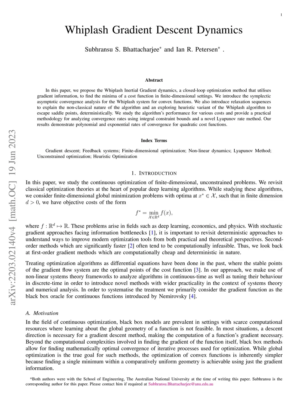 In this paper, we propose the Whiplash Inertial Gradient dynamics, a closed-loop optimization method that utilises gradient information, to find the minima of a cost function in finite-dimensional settings. We introduce the symplectic asymptotic convergence analysis for the Whiplash system for convex functions. We also introduce relaxation sequences to explain the non-classical nature of the algorithm and an exploring heuristic variant of the Whiplash algorithm to escape saddle points, deterministically. We study the algorithm's performance for various costs and provide a practical methodology for analyzing convergence rates using integral constraint bounds and a novel Lyapunov rate method. Our results demonstrate polynomial and exponential rates of convergence for quadratic cost functions.