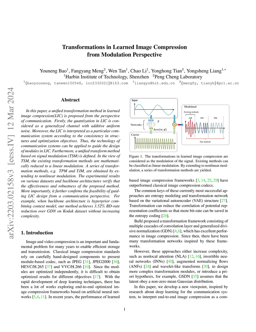 In this paper, a unified transformation method in learned image compression(LIC) is proposed from the perspective of modulation. Firstly, the quantization in LIC is considered as a generalized channel with additive uniform noise. Moreover, the LIC is interpreted as a particular communication system according to the consistency in structures and optimization objectives. Thus, the technology of communication systems can be applied to guide the design of modules in LIC. Furthermore, a unified transform method based on signal modulation (TSM) is defined. In the view of TSM, the existing transformation methods are mathematically reduced to a linear modulation. A series of transformation methods, e.g. TPM and TJM, are obtained by extending to nonlinear modulation. The experimental results on various datasets and backbone architectures verify that the effectiveness and robustness of the proposed method. More importantly, it further confirms the feasibility of guiding LIC design from a communication perspective. For example, when backbone architecture is hyperprior combining context model, our method achieves 3.52 BD-rate reduction over GDN on Kodak dataset without increasing complexity.