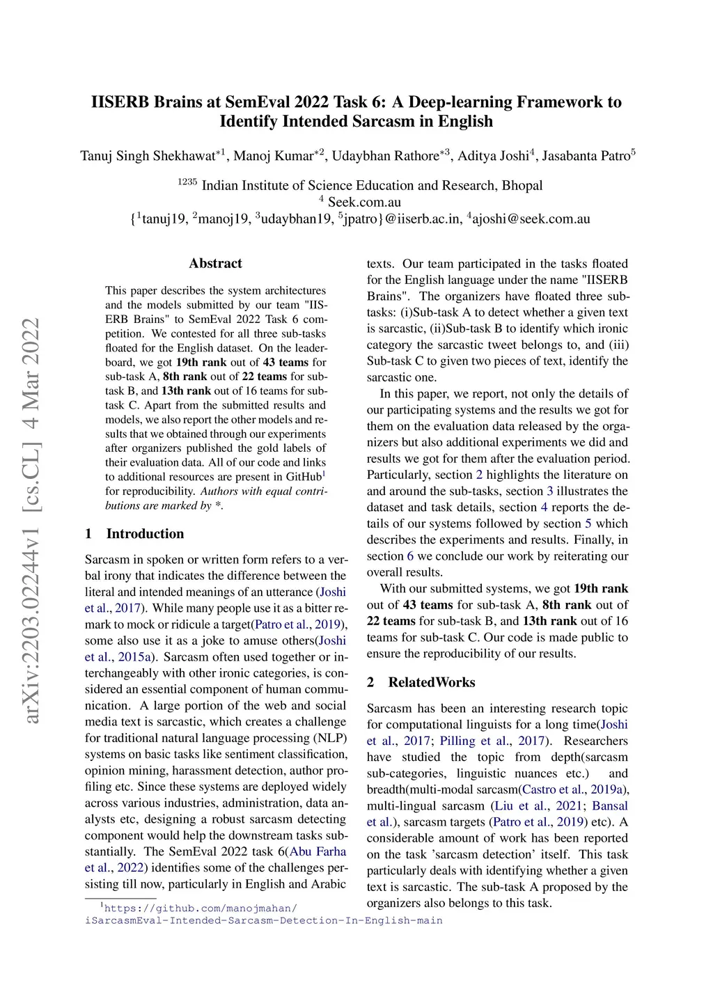 IISERB Brains at SemEval 2022 Task 6: A Deep-learning Framework to