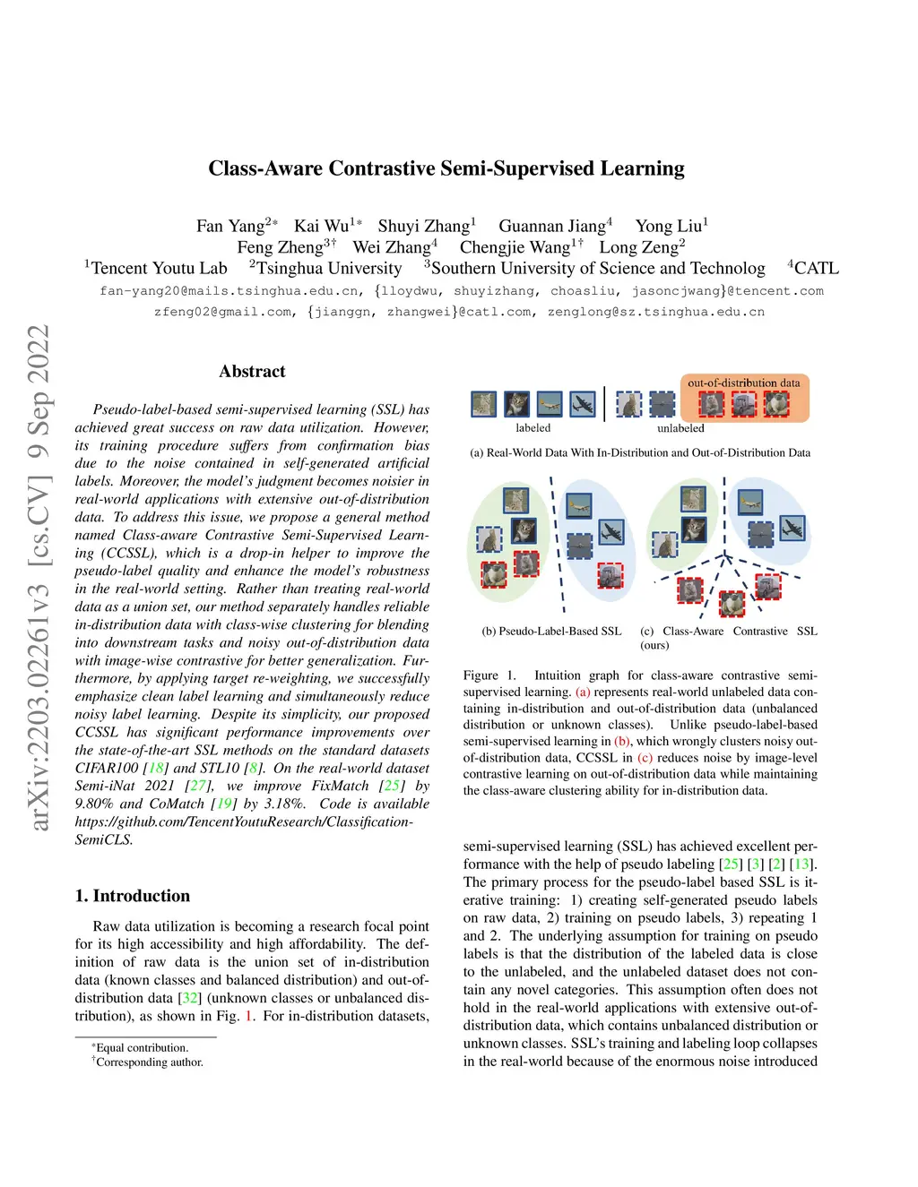 Pseudo-label-based semi-supervised learning (SSL) has achieved great success on raw data utilization. However, its training procedure suffers from confirmation bias due to the noise contained in self-generated artificial labels. Moreover, the model's judgment becomes noisier in real-world applications with extensive out-of-distribution data. To address this issue, we propose a general method named Class-aware Contrastive Semi-Supervised Learning (CCSSL), which is a drop-in helper to improve the pseudo-label quality and enhance the model's robustness in the real-world setting. Rather than treating real-world data as a union set, our method separately handles reliable in-distribution data with class-wise clustering for blending into downstream tasks and noisy out-of-distribution data with image-wise contrastive for better generalization. Furthermore, by applying target re-weighting, we successfully emphasize clean label learning and simultaneously reduce noisy label learning. Despite its simplicity, our proposed CCSSL has significant performance improvements over the state-of-the-art SSL methods on the standard datasets CIFAR100 and STL10. On the real-world dataset Semi-iNat 2021, we improve FixMatch by 9.80% and CoMatch by 3.18%. Code is available https://github.com/TencentYoutuResearch/Classification-SemiCLS.
