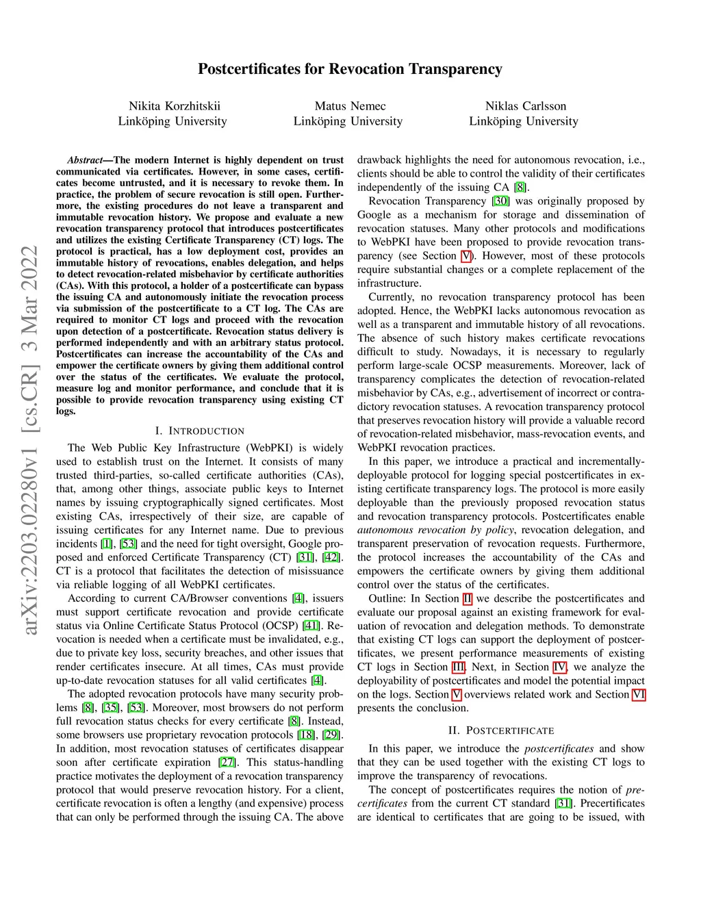 The modern Internet is highly dependent on trust communicated via certificates. However, in some cases, certificates become untrusted, and it is necessary to revoke them. In practice, the problem of secure revocation is still open. Furthermore, the existing procedures do not leave a transparent and immutable revocation history. We propose and evaluate a new revocation transparency protocol that introduces postcertificates and utilizes the existing Certificate Transparency (CT) logs. The protocol is practical, has a low deployment cost, provides an immutable history of revocations, enables delegation, and helps to detect revocation-related misbehavior by certificate authorities (CAs). With this protocol, a holder of a postcertificate can bypass the issuing CA and autonomously initiate the revocation process via submission of the postcertificate to a CT log. The CAs are required to monitor CT logs and proceed with the revocation upon detection of a postcertificate. Revocation status delivery is performed independently and with an arbitrary status protocol. Postcertificates can increase the accountability of the CAs and empower the certificate owners by giving them additional control over the status of the certificates. We evaluate the protocol, measure log and monitor performance, and conclude that it is possible to provide revocation transparency using existing CT logs.