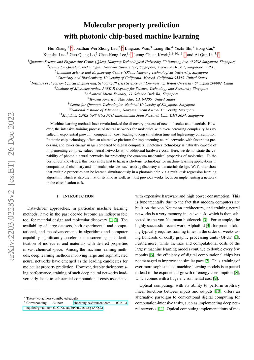 Machine learning methods have revolutionized the discovery process of new molecules and materials. However, the intensive training process of neural networks for molecules with ever-increasing complexity has resulted in exponential growth in computation cost, leading to long simulation time and high energy consumption. Photonic chip technology offers an alternative platform for implementing neural networks with faster data processing and lower energy usage compared to digital computers. Photonics technology is naturally capable of implementing complex-valued neural networks at no additional hardware cost. Here, we demonstrate the capability of photonic neural networks for predicting the quantum mechanical properties of molecules. To the best of our knowledge, this work is the first to harness photonic technology for machine learning applications in computational chemistry and molecular sciences, such as drug discovery and materials design. We further show that multiple properties can be learned simultaneously in a photonic chip via a multi-task regression learning algorithm, which is also the first of its kind as well, as most previous works focus on implementing a network in the classification task.