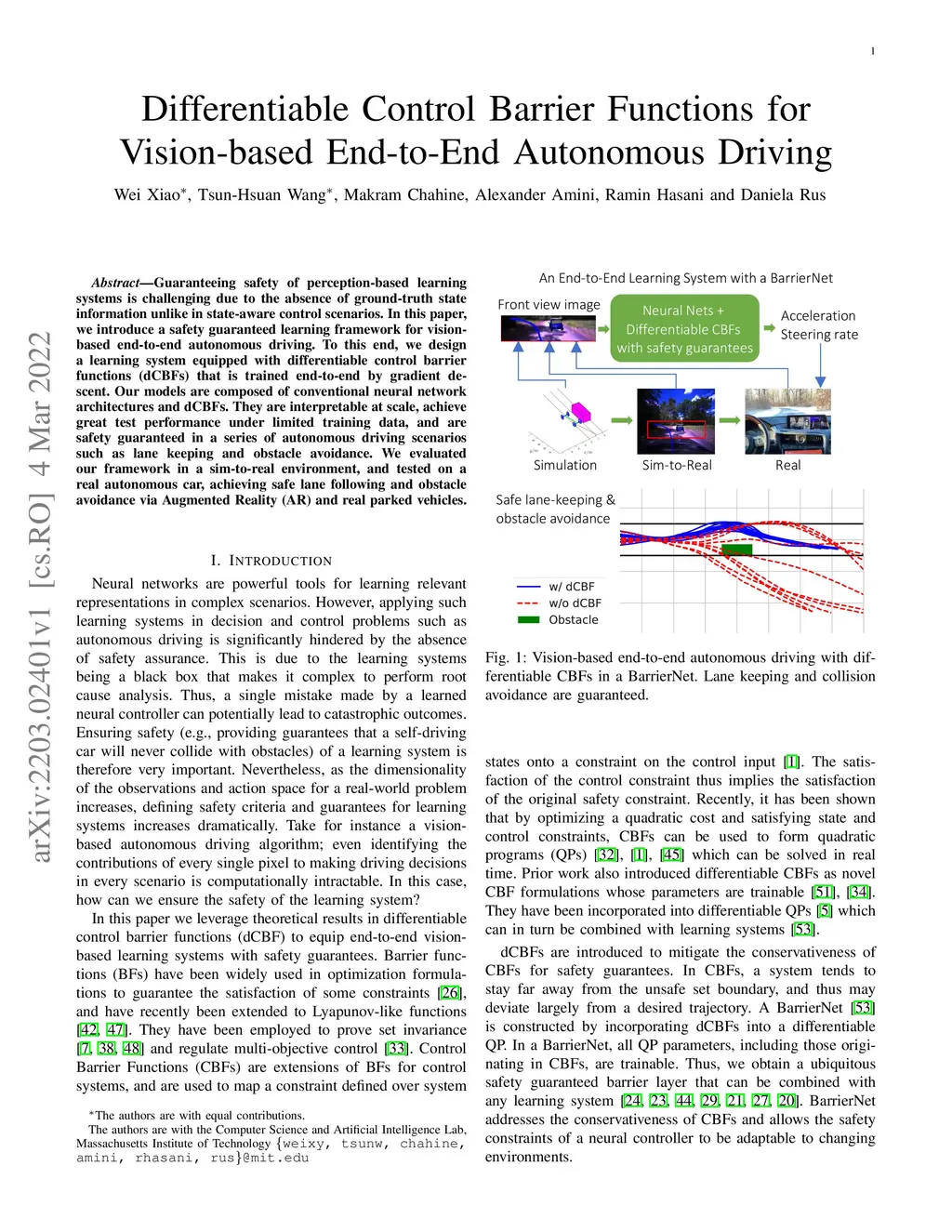 Guaranteeing safety of perception-based learning systems is challenging due to the absence of ground-truth state information unlike in state-aware control scenarios. In this paper, we introduce a safety guaranteed learning framework for vision-based end-to-end autonomous driving. To this end, we design a learning system equipped with differentiable control barrier functions (dCBFs) that is trained end-to-end by gradient descent. Our models are composed of conventional neural network architectures and dCBFs. They are interpretable at scale, achieve great test performance under limited training data, and are safety guaranteed in a series of autonomous driving scenarios such as lane keeping and obstacle avoidance. We evaluated our framework in a sim-to-real environment, and tested on a real autonomous car, achieving safe lane following and obstacle avoidance via Augmented Reality (AR) and real parked vehicles.