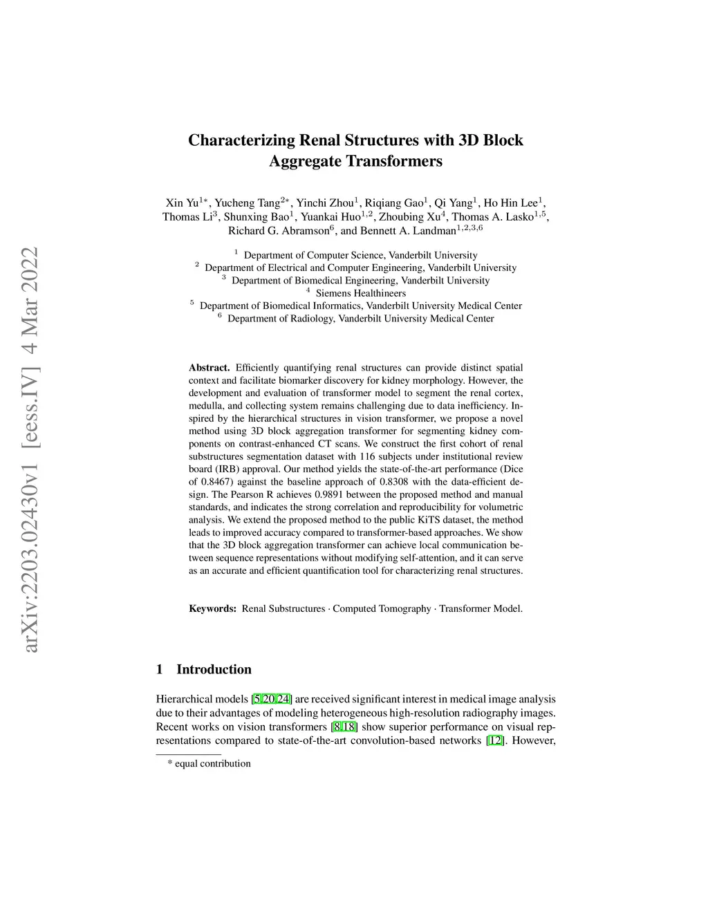 Characterizing Renal Structures with 3D Block Aggregate Transformers