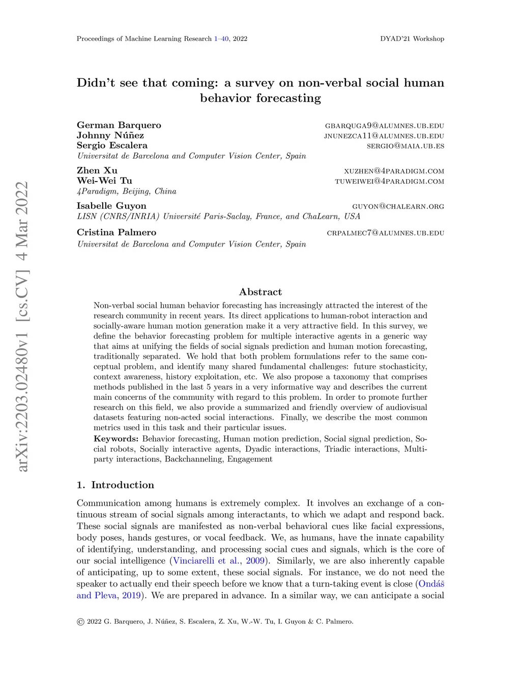 Non-verbal social human behavior forecasting has increasingly attracted the interest of the research community in recent years. Its direct applications to human-robot interaction and socially-aware human motion generation make it a very attractive field. In this survey, we define the behavior forecasting problem for multiple interactive agents in a generic way that aims at unifying the fields of social signals prediction and human motion forecasting, traditionally separated. We hold that both problem formulations refer to the same conceptual problem, and identify many shared fundamental challenges: future stochasticity, context awareness, history exploitation, etc. We also propose a taxonomy that comprises methods published in the last 5 years in a very informative way and describes the current main concerns of the community with regard to this problem. In order to promote further research on this field, we also provide a summarised and friendly overview of audiovisual datasets featuring non-acted social interactions. Finally, we describe the most common metrics used in this task and their particular issues.