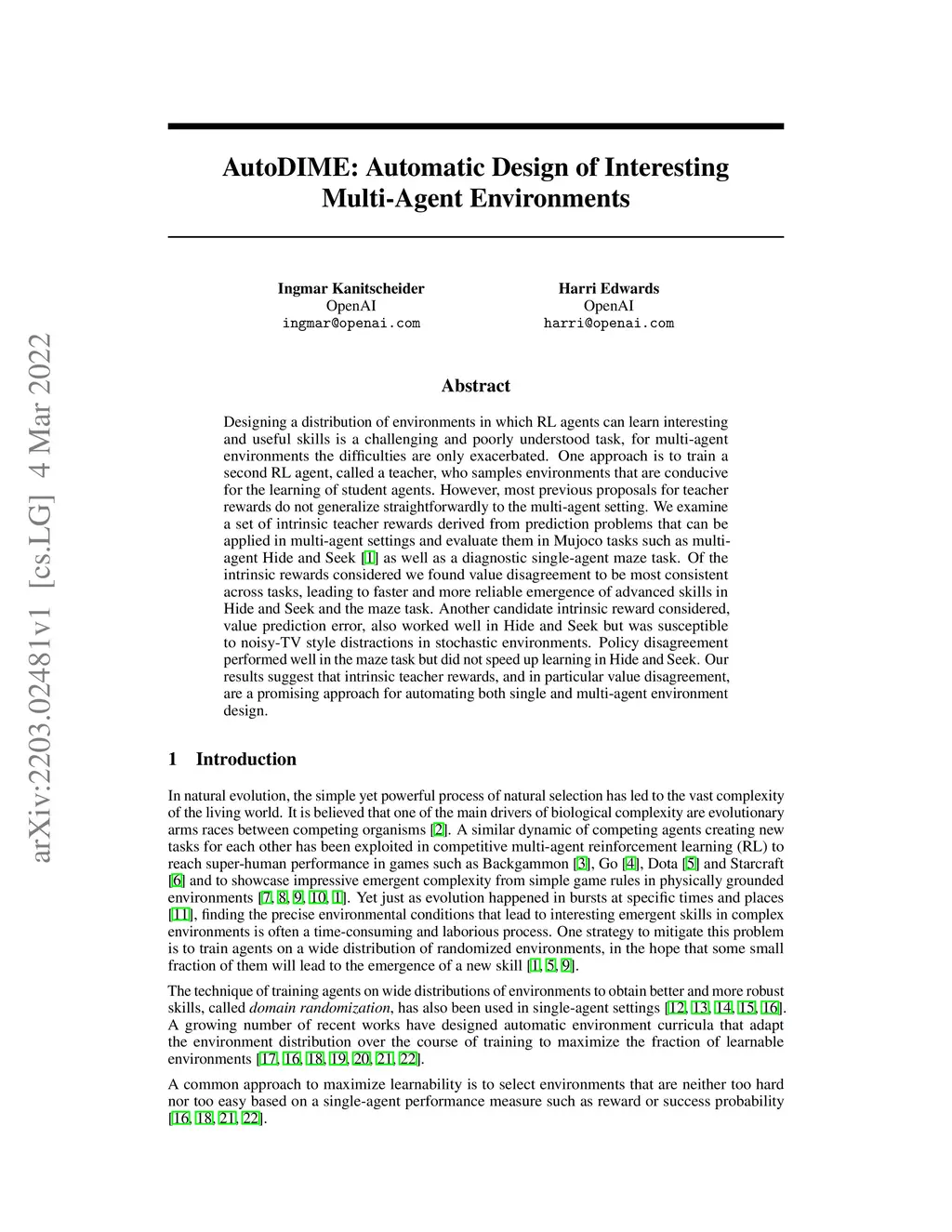Designing a distribution of environments in which RL agents can learn interesting and useful skills is a challenging and poorly understood task, for multi-agent environments the difficulties are only exacerbated. One approach is to train a second RL agent, called a teacher, who samples environments that are conducive for the learning of student agents. However, most previous proposals for teacher rewards do not generalize straightforwardly to the multi-agent setting. We examine a set of intrinsic teacher rewards derived from prediction problems that can be applied in multi-agent settings and evaluate them in Mujoco tasks such as multi-agent Hide and Seek as well as a diagnostic single-agent maze task. Of the intrinsic rewards considered we found value disagreement to be most consistent across tasks, leading to faster and more reliable emergence of advanced skills in Hide and Seek and the maze task. Another candidate intrinsic reward considered, value prediction error, also worked well in Hide and Seek but was susceptible to noisy-TV style distractions in stochastic environments. Policy disagreement performed well in the maze task but did not speed up learning in Hide and Seek. Our results suggest that intrinsic teacher rewards, and in particular value disagreement, are a promising approach for automating both single and multi-agent environment design.