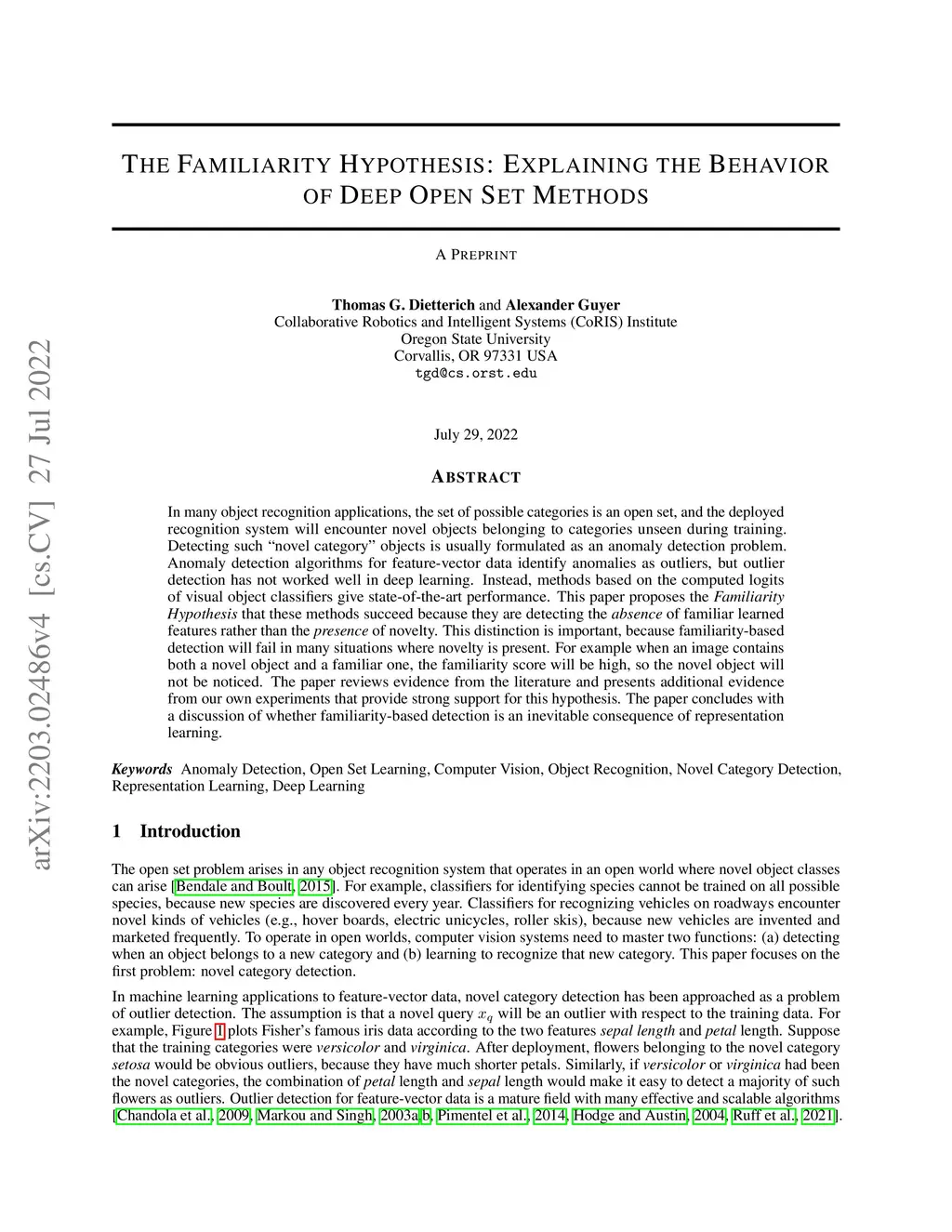 In many object recognition applications, the set of possible categories is an open set, and the deployed recognition system will encounter novel objects belonging to categories unseen during training. Detecting such "novel category" objects is usually formulated as an anomaly detection problem. Anomaly detection algorithms for feature-vector data identify anomalies as outliers, but outlier detection has not worked well in deep learning. Instead, methods based on the computed logits of visual object classifiers give state-of-the-art performance. This paper proposes the Familiarity Hypothesis that these methods succeed because they are detecting the absence of familiar learned features rather than the presence of novelty. This distinction is important, because familiarity-based detection will fail in many situations where novelty is present. For example when an image contains both a novel object and a familiar one, the familiarity score will be high, so the novel object will not be noticed. The paper reviews evidence from the literature and presents additional evidence from our own experiments that provide strong support for this hypothesis. The paper concludes with a discussion of whether familiarity-based detection is an inevitable consequence of representation learning.